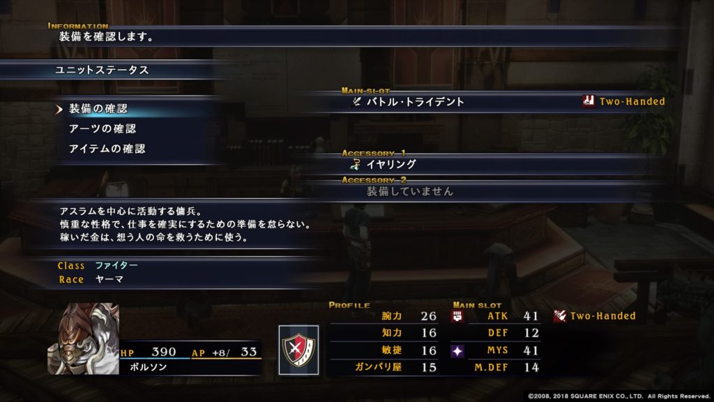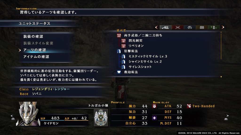 腕力が非常に高く、物理攻撃特化型に育てると超一流のキャラになりますが、狙撃術法を初めから覚えていて、救助術法も覚えるので、術法攻撃・回復キャラとしても活躍できます。