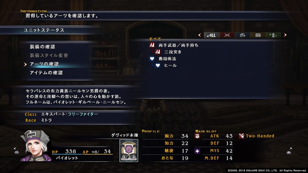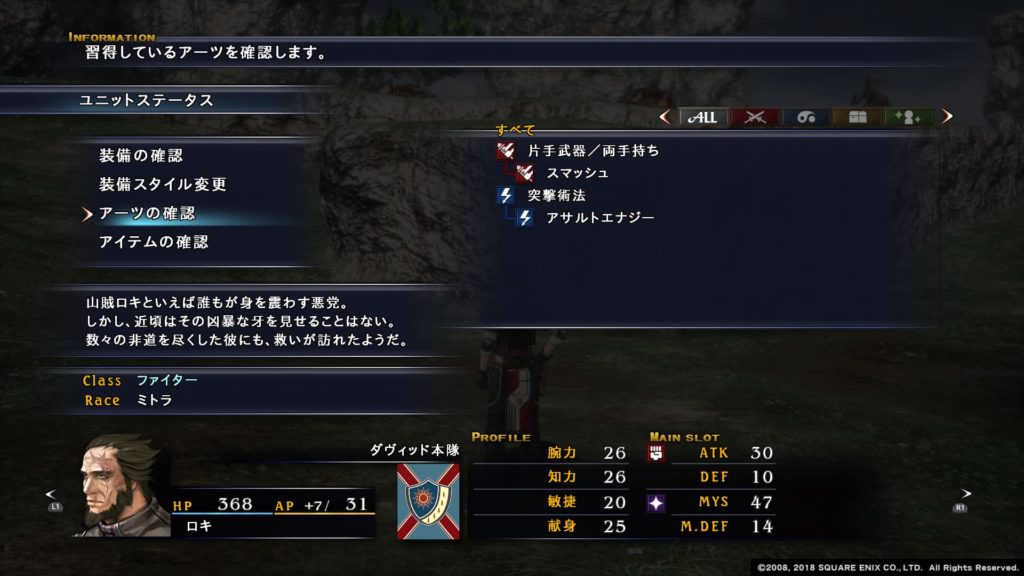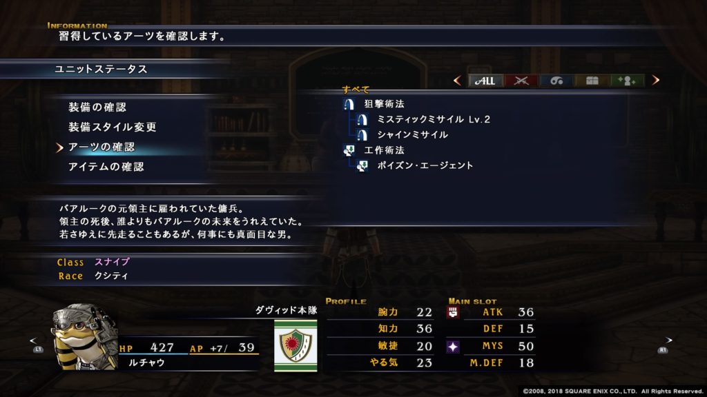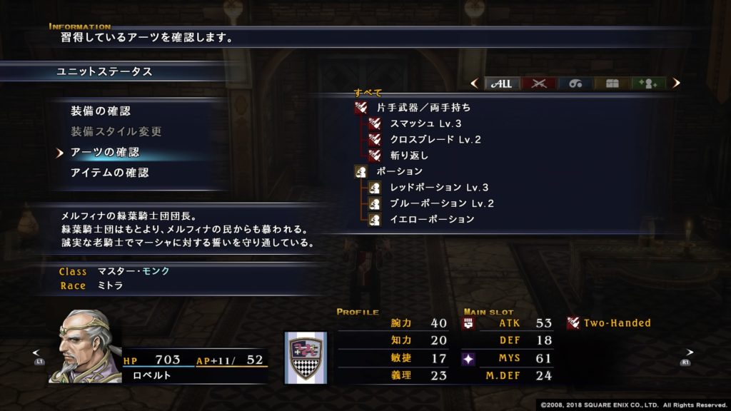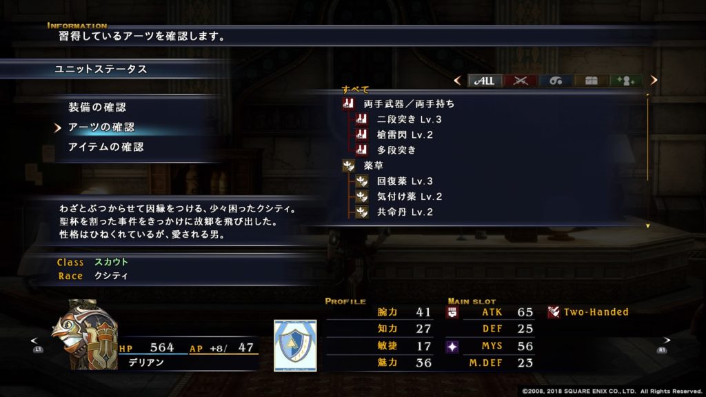 またアイテムアーツであるローションを覚えるので、回復や治療でも活躍してくれます。特にローションの活性ローションはKO状態のユニットを回復する効果があるので長期戦で大活躍します。