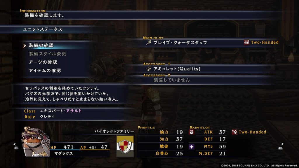 セラパレスで将軍を務めていたクシティーであり、パグズの学友です。能力値も技能もパグズによく似ており、同様のキャラ育成が可能です。