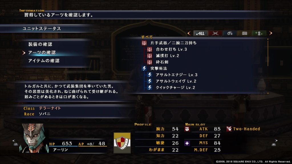 覚えるアーツが「突撃」「爆薬」「トラップ」「工作」「魔片」と多く覚えます。どれも使いたいところですが、物理特化にしないと腕力がもったいないので、使わないアーツは封印すると良いでしょう。