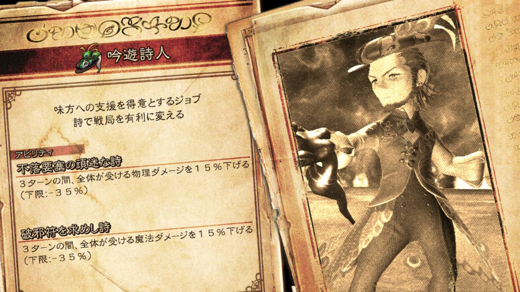 ジョブにはジョブ特性という常に効果があるアビリティと、バトル中に使うことができるコマンドアビリティ、装備することで効果があるサポートアビリティがあります。