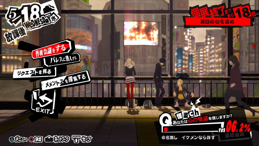 学生パートと怪盗パートがあり、学生パートでの学校ではパレスの準備やレベルアップのためのイベントなどを行います。