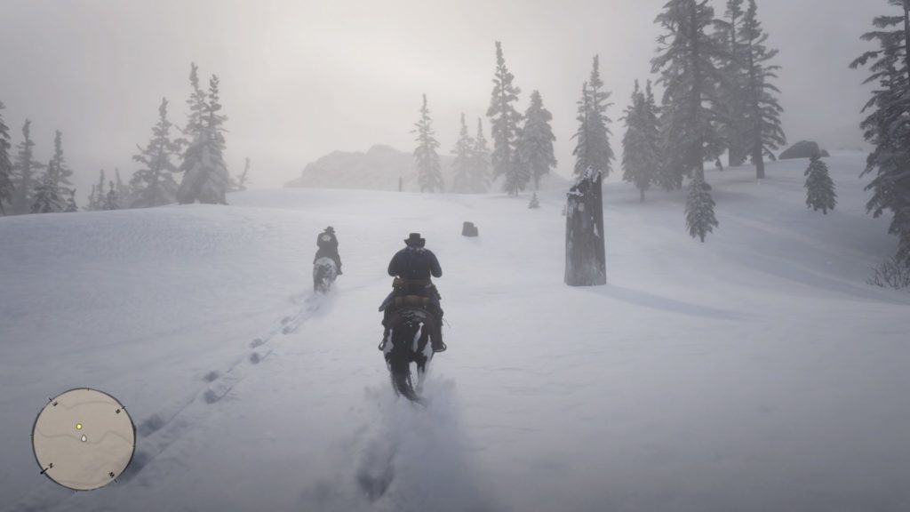 雪山でキャラクターが歩くと足跡がつきますが、馬での行動の時は馬で走った跡がつきます。