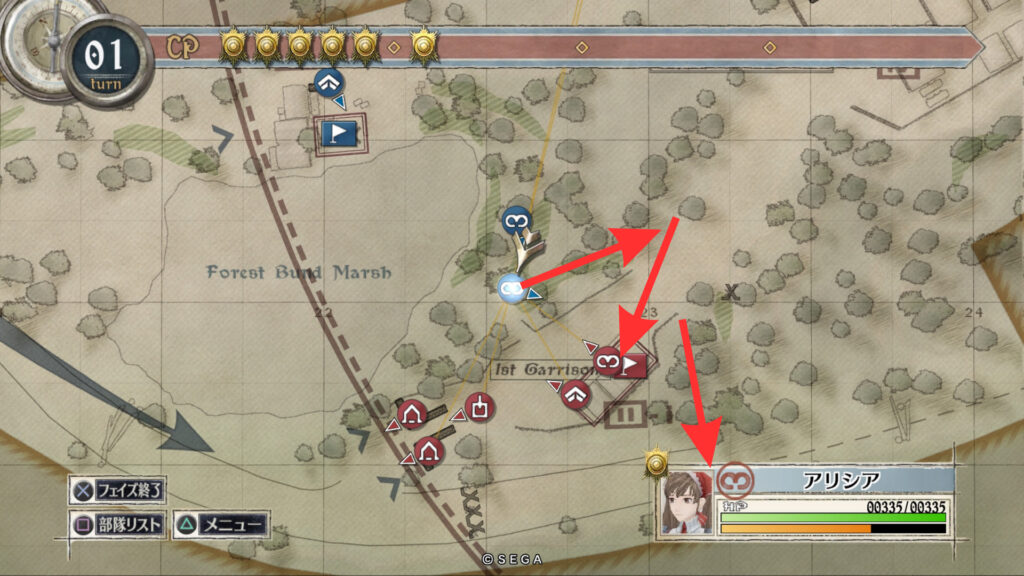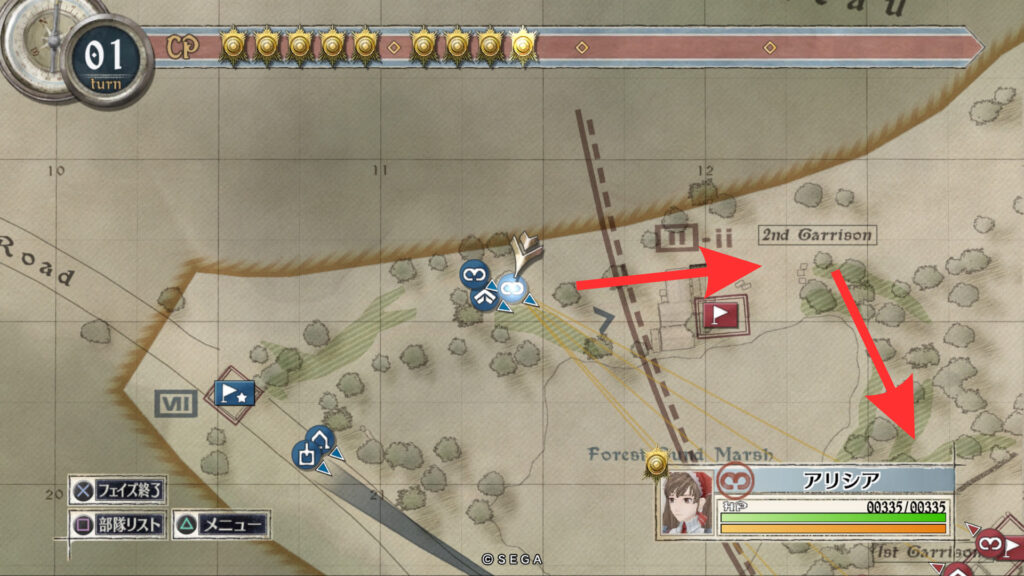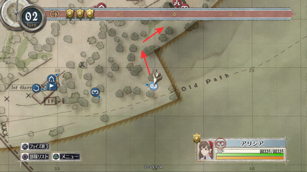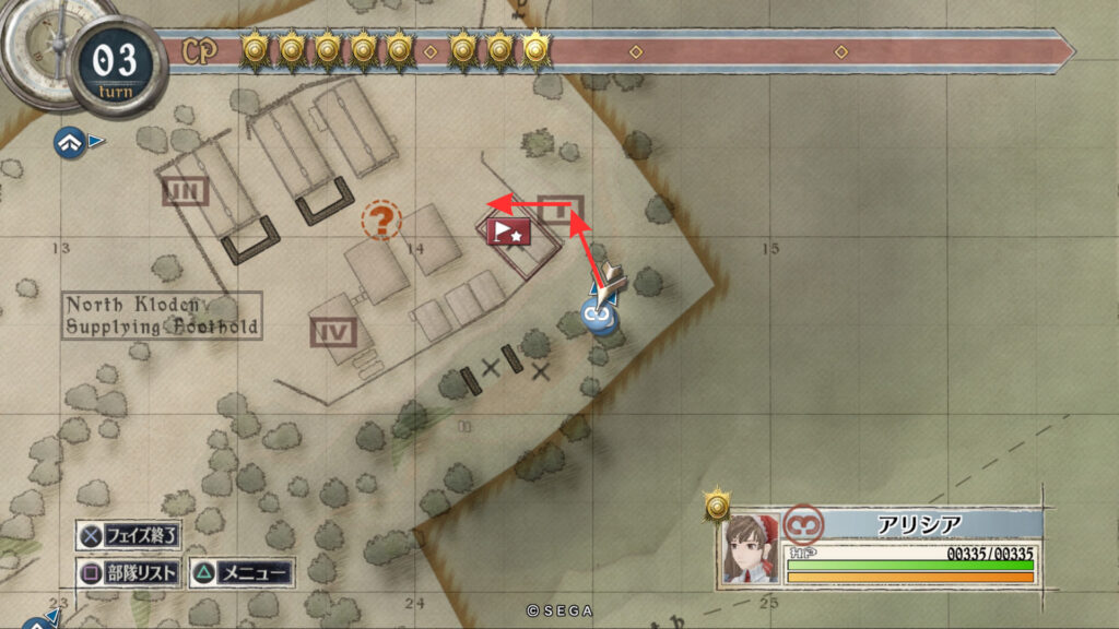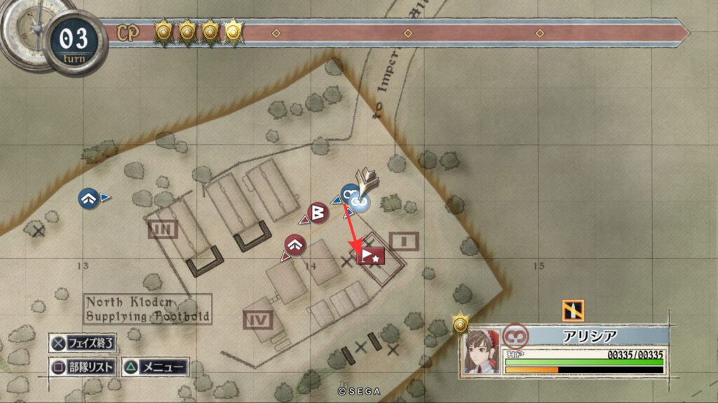 アリシアを南東の敵拠点まで移動させて帝国偵察兵を倒します。そしてそのまま敵拠点を北に向かいすぐ右に曲がって進みます。