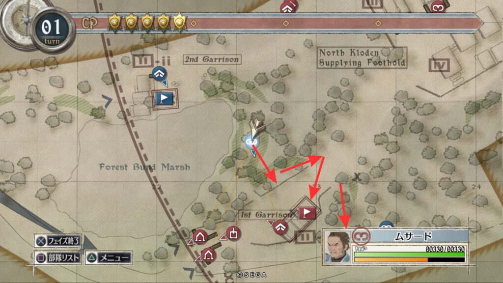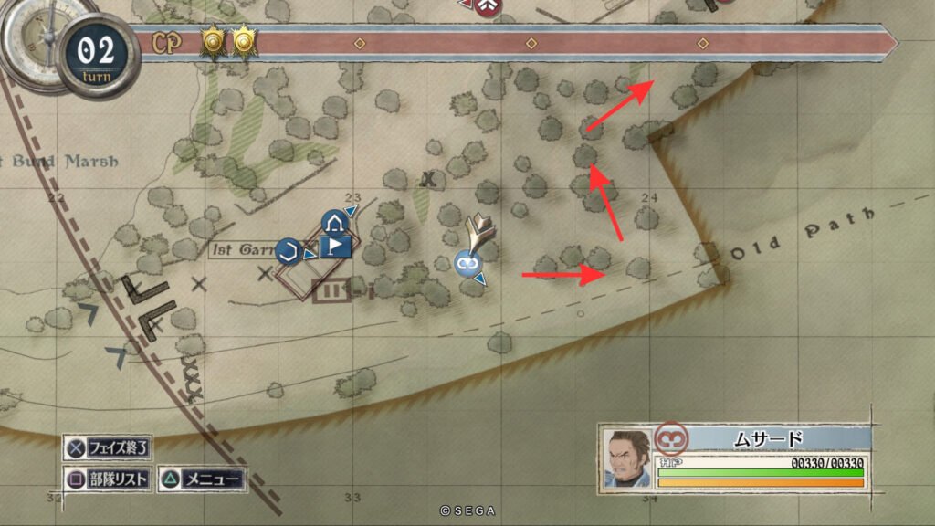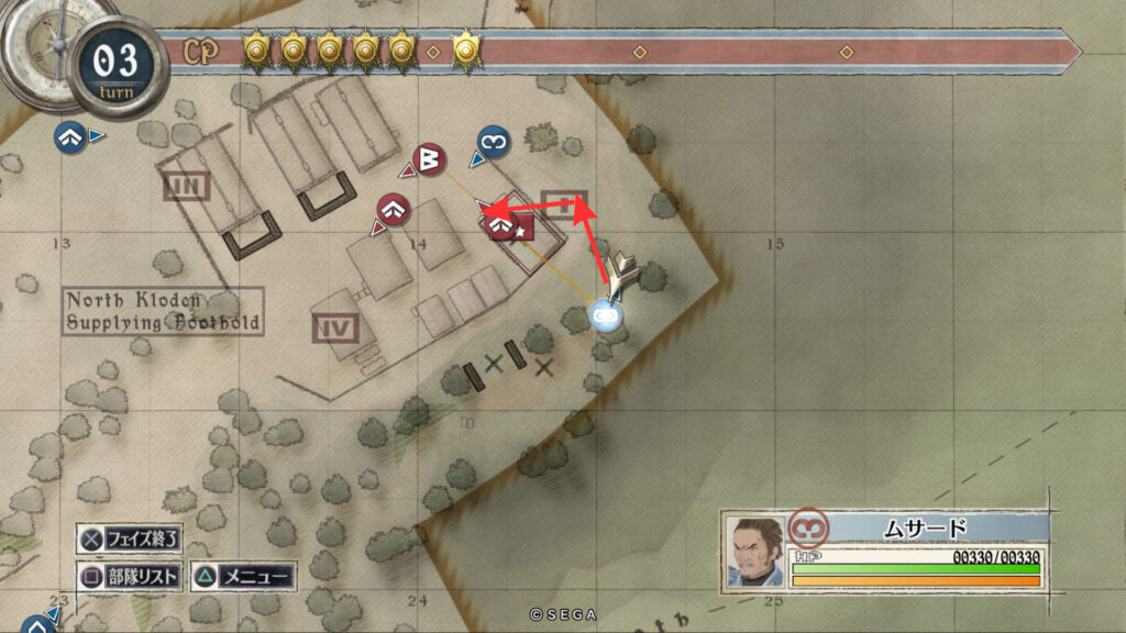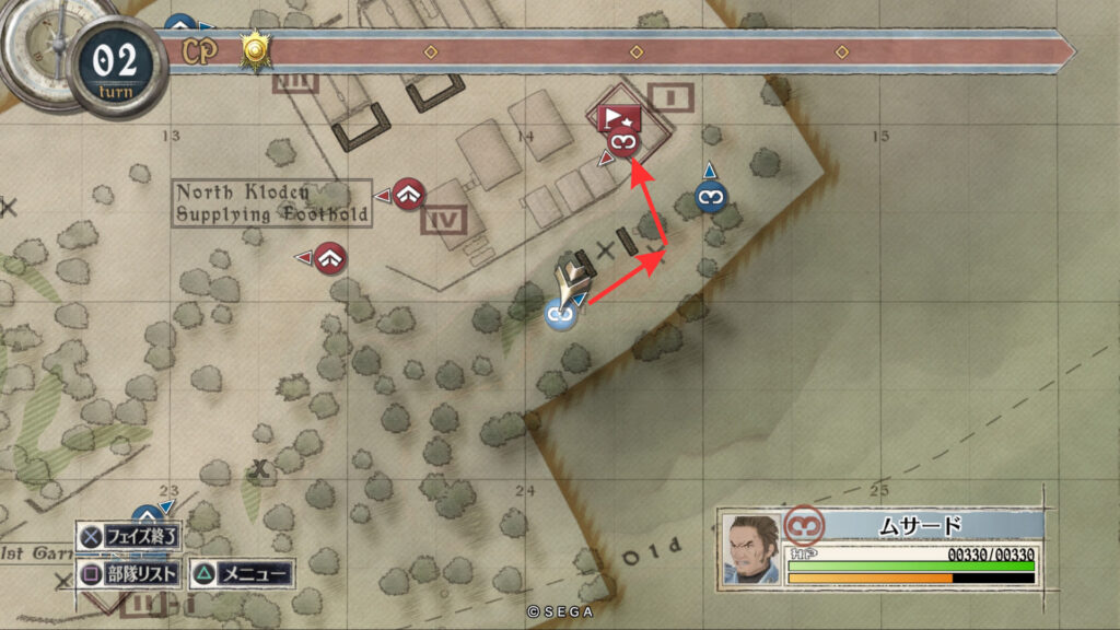 ムサードもアリシアと同じルートで進み敵拠点にいる帝国突撃兵を倒します。そのまま敵拠点を占拠したあと北東へ向かいすぐ右に曲がり脇道に入ります。