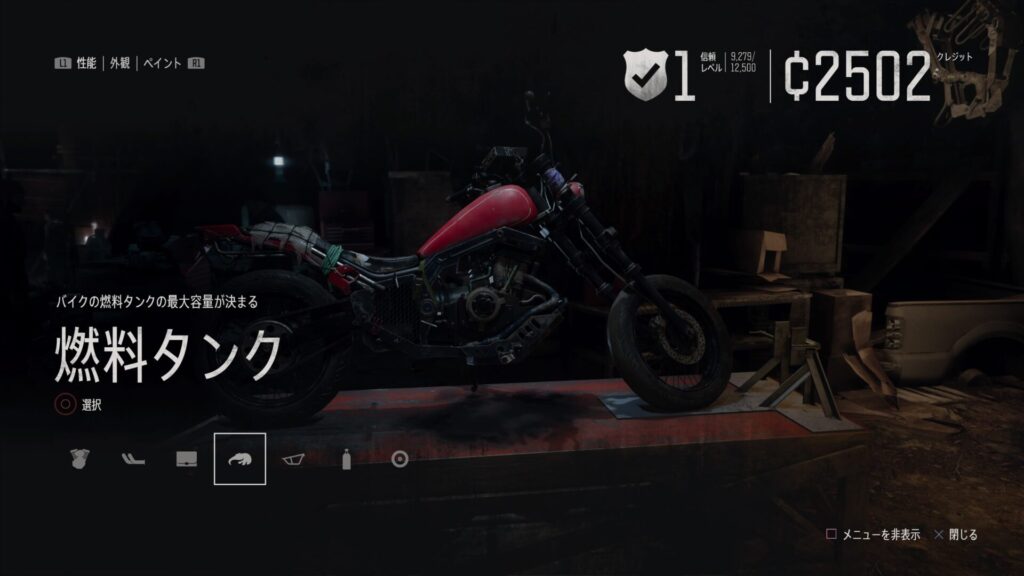 バイクってかっこいいので外見からカスタマイズしがちですね。でも序盤から性能をアップしておくと断然探索の効率が良くなります。