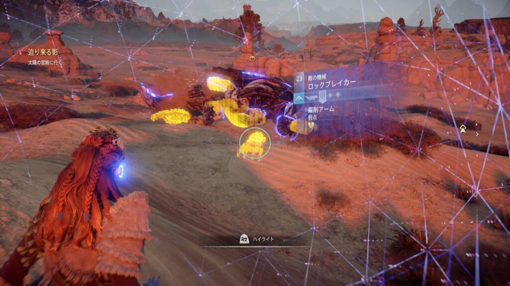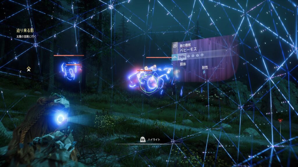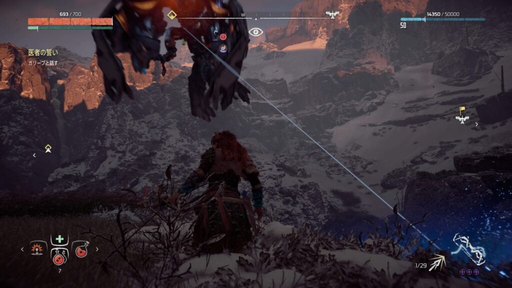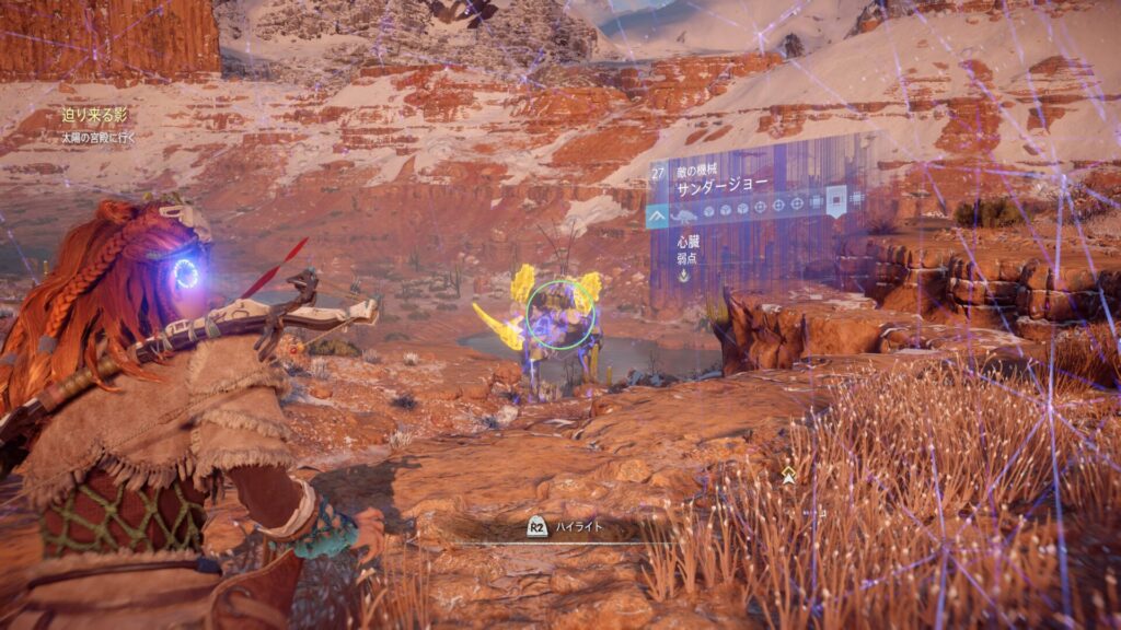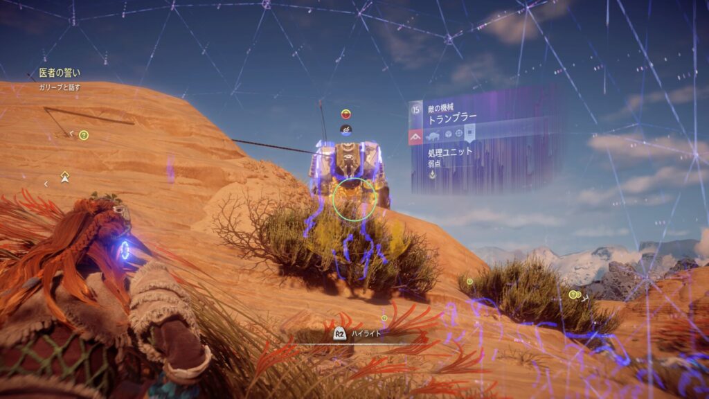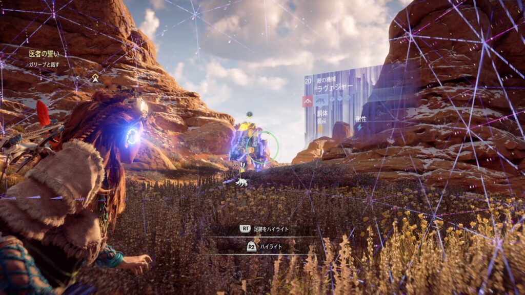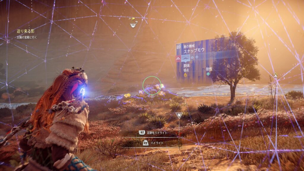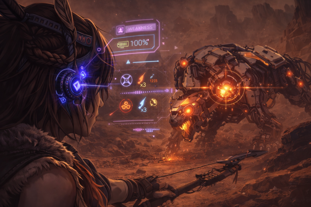 『Horizon Zero Dawn』では、フォーカスを活用して敵の情報を確認することが戦闘の基本になります。フォーカスを使うと、機械獣の弱点となる部位や属性耐性が視覚的に表示されるため、「どこを狙えば効率よくダメージを与えられるか」が一目で分かります。これを使わずに戦うと、無駄に硬い部分を攻撃してしまい、倒すまでに時間がかかってしまいます。