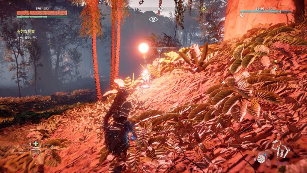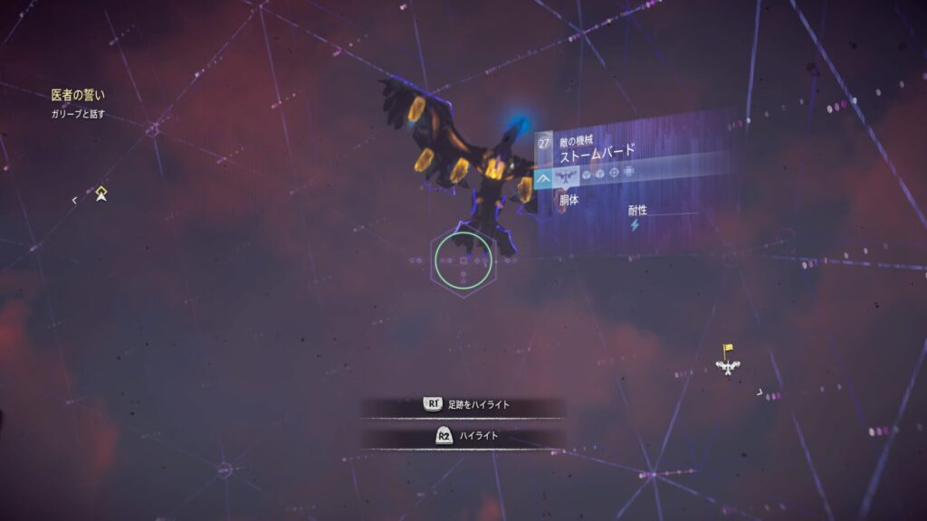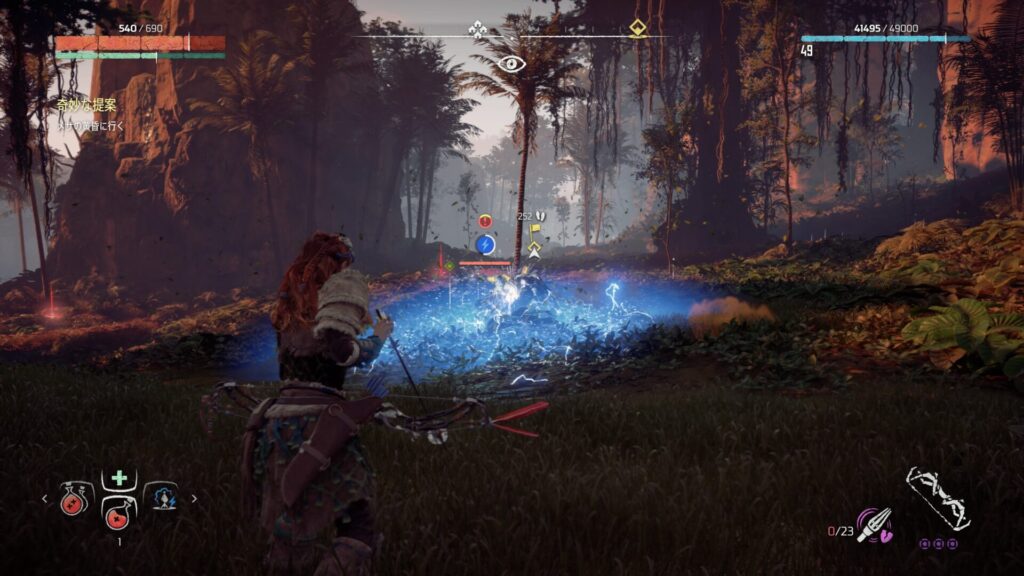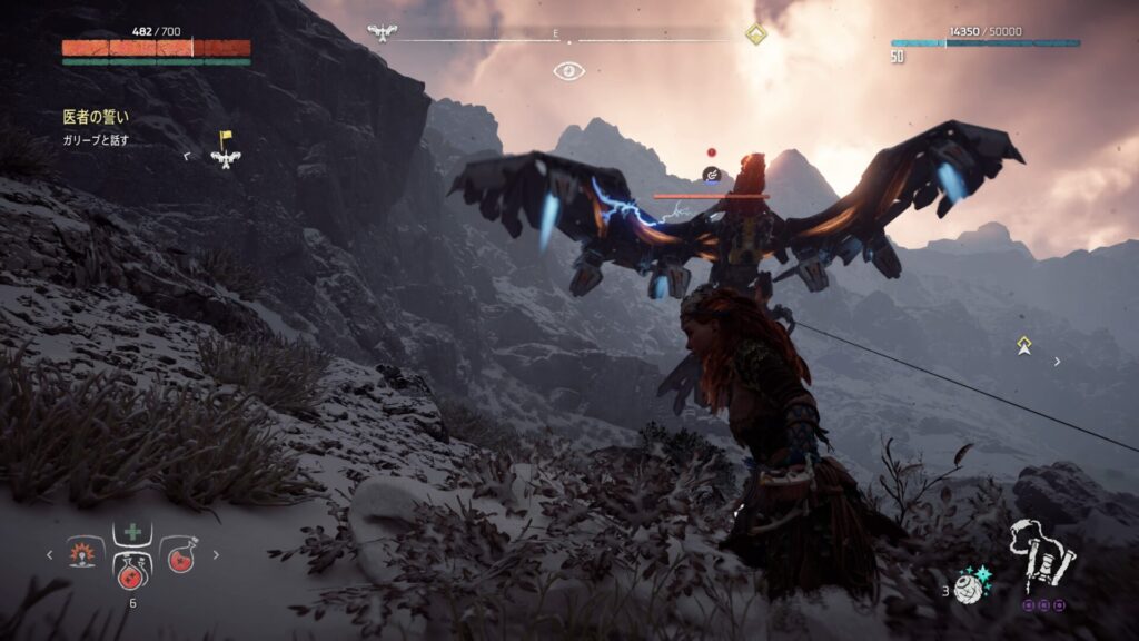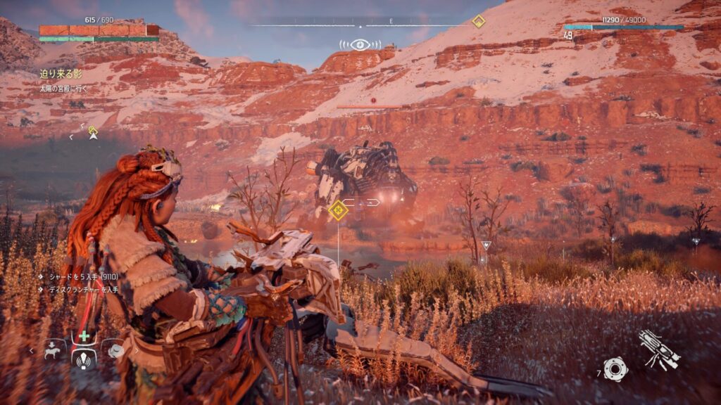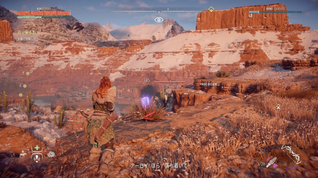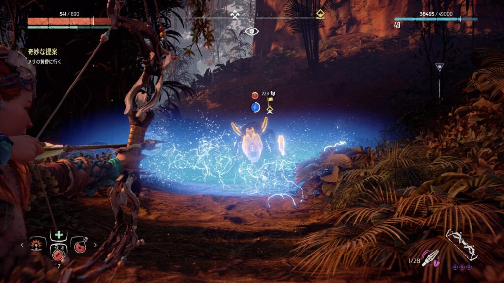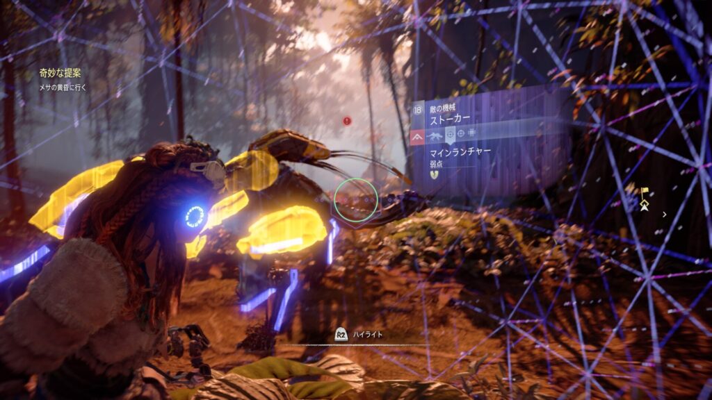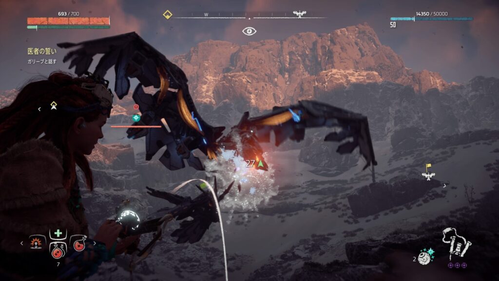 『Horizon Zero Dawn』では、フォーカスを活用して敵の情報を確認することが戦闘の基本になります。フォーカスを使うと、機械獣の弱点となる部位や属性耐性が視覚的に表示されるため、「どこを狙えば効率よくダメージを与えられるか」が一目で分かります。これを使わずに戦うと、無駄に硬い部分を攻撃してしまい、倒すまでに時間がかかってしまいます。