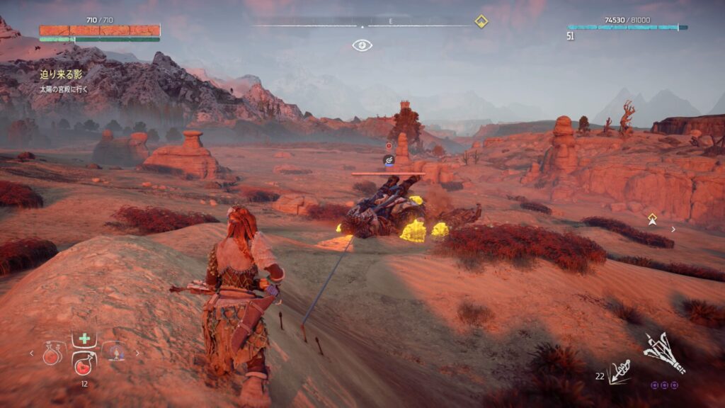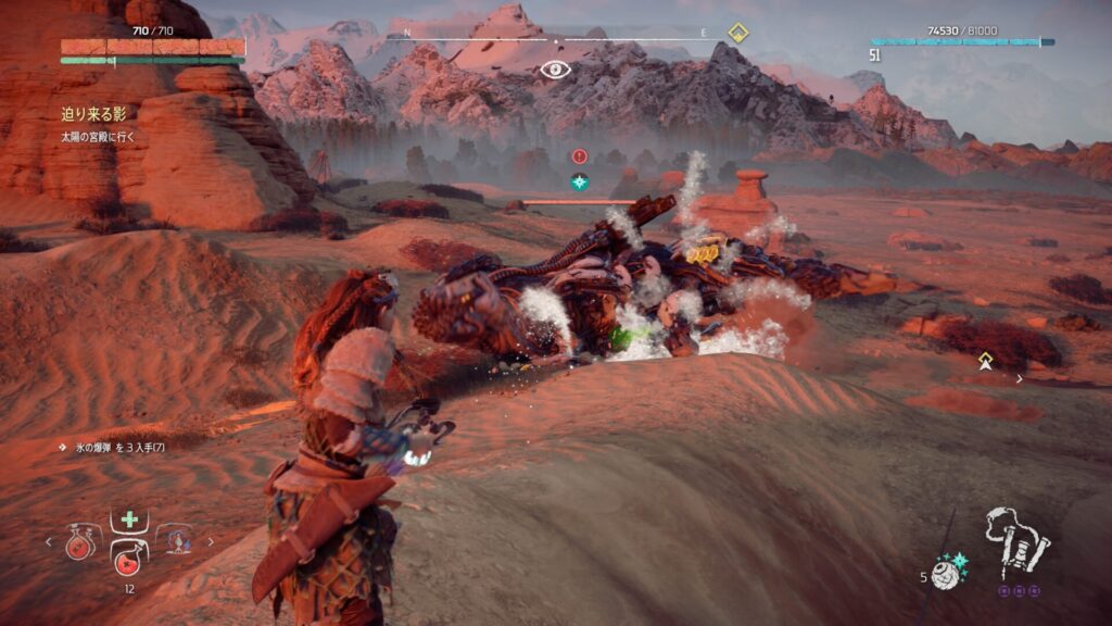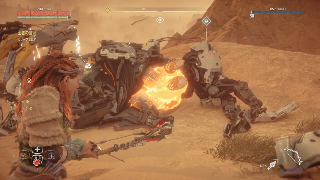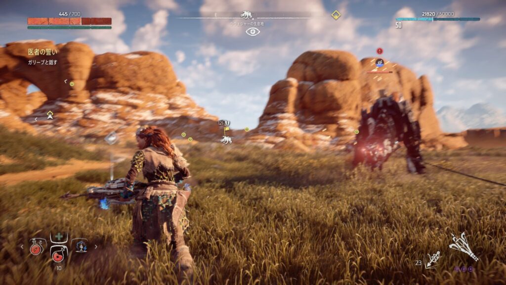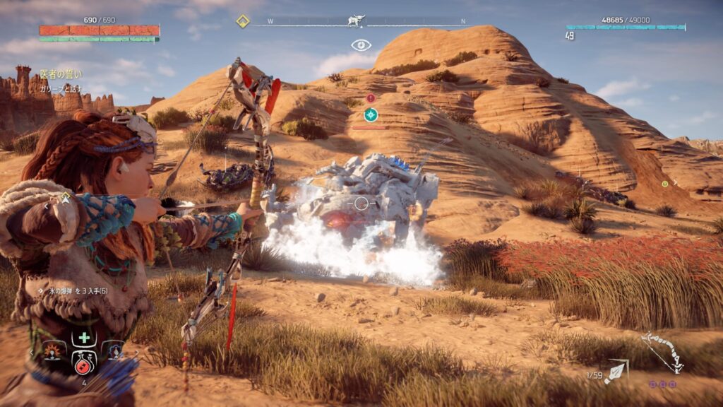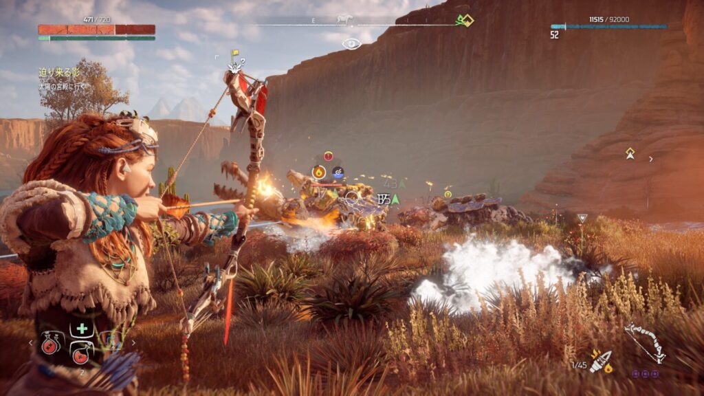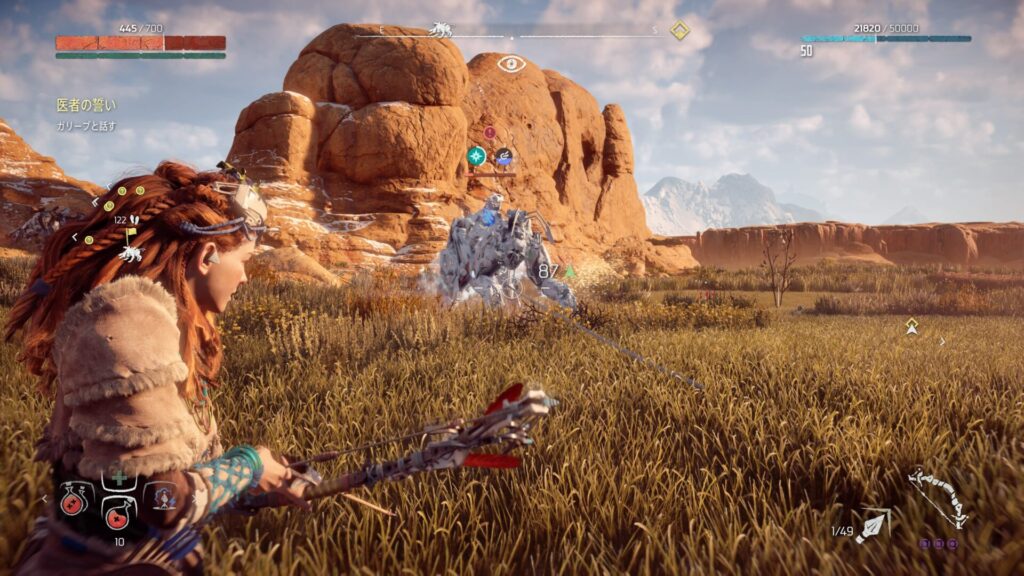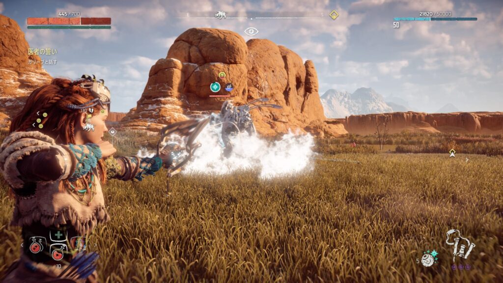 戦闘中は常に敵との距離を意識することが大切です。近づきすぎると強力な攻撃を受けやすくなり、回避が間に合わない場面も増えてしまいます。特に大型の機械獣は攻撃範囲が広いため、無理に接近すると大きなダメージを受けるリスクがあります。そのため、基本は一定の距離を保ちながら弓で攻撃するのが安全です。距離を取ることで敵の動きを冷静に見極めることができ、回避のタイミングも取りやすくなります。