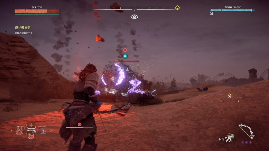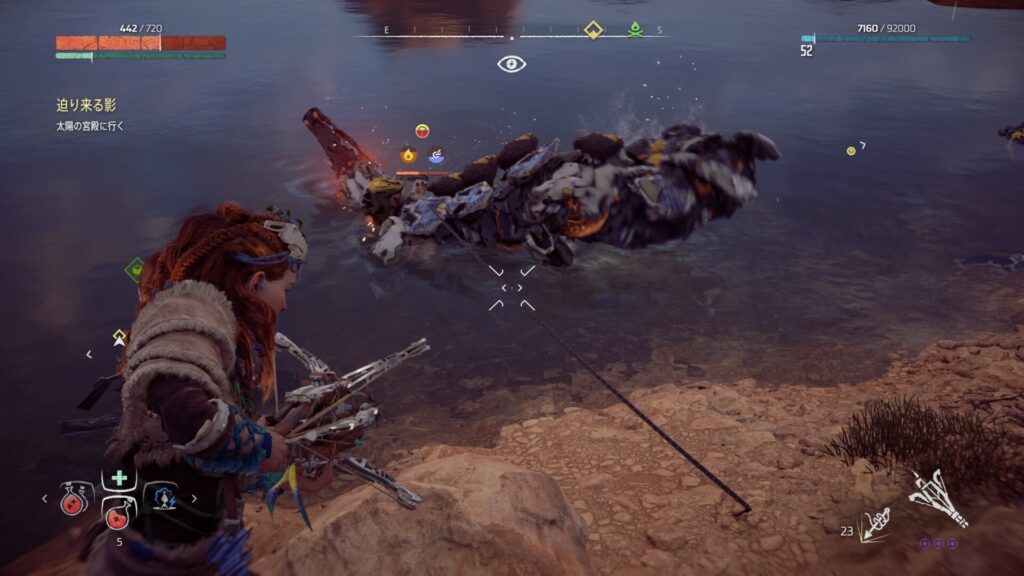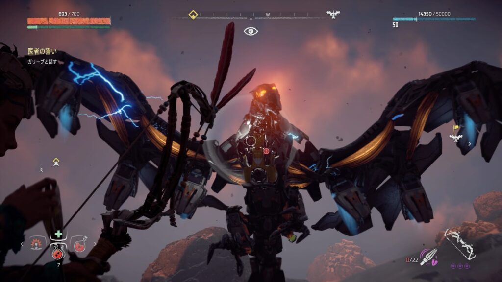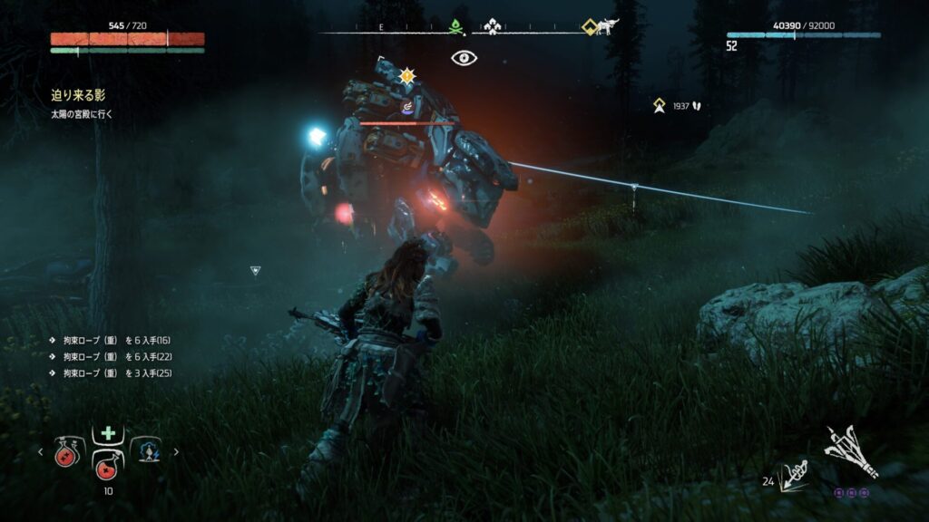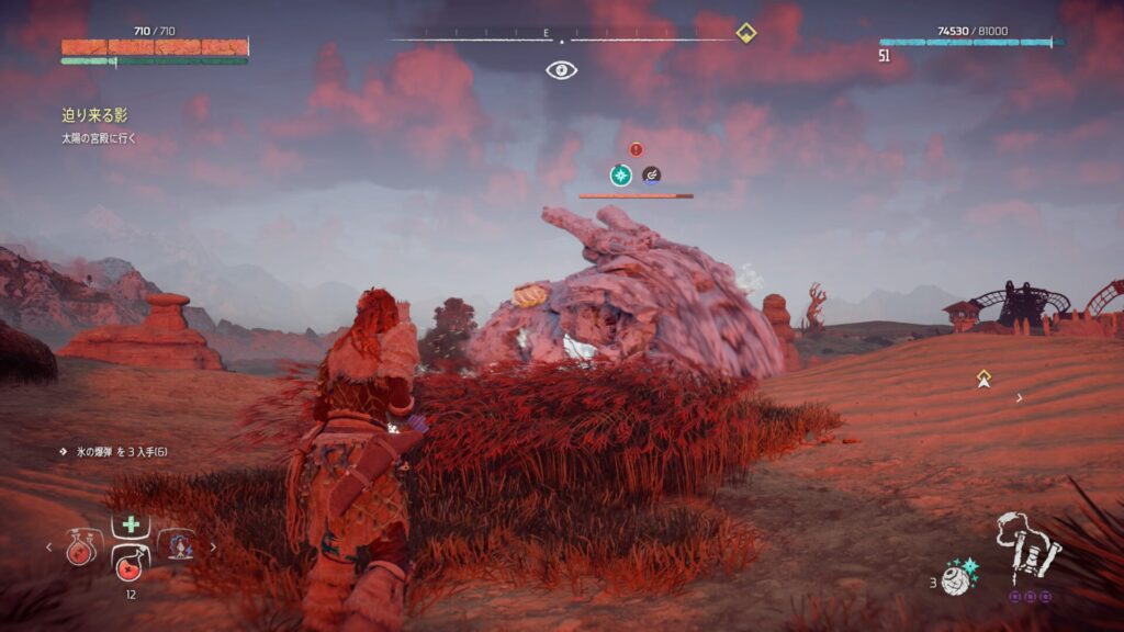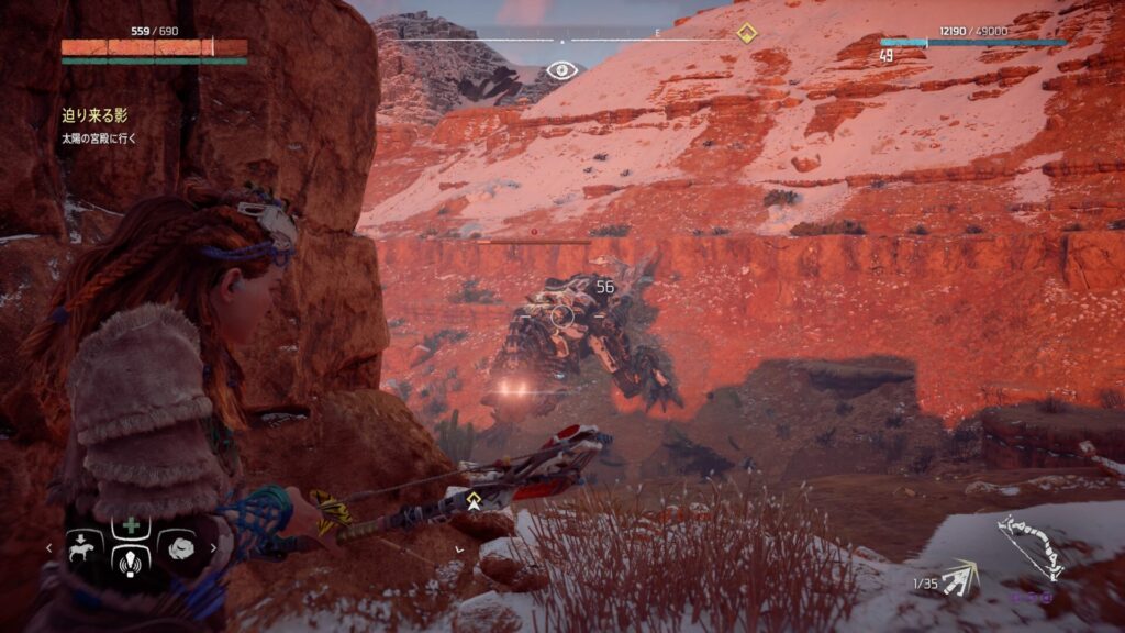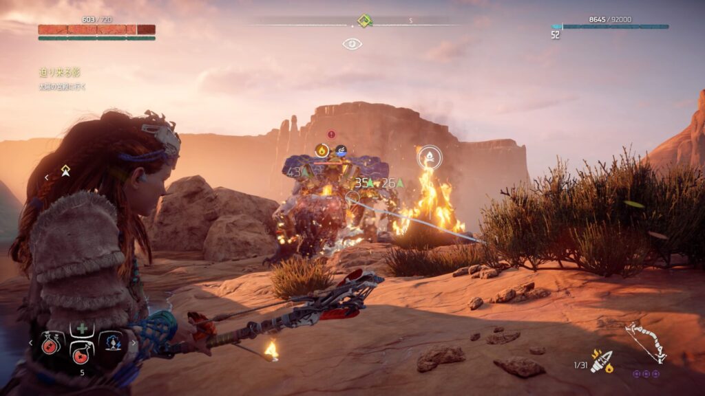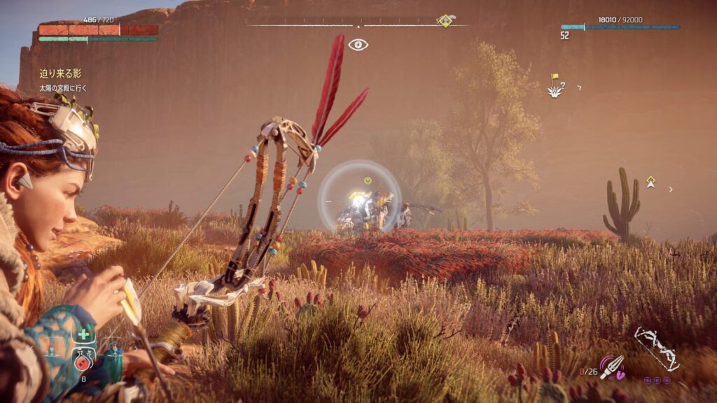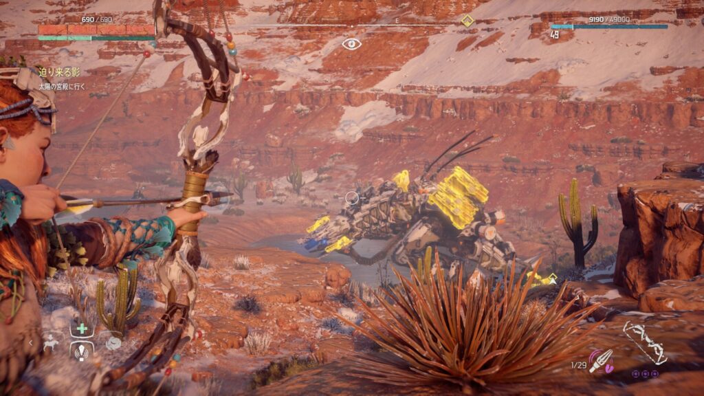 戦闘中は常に敵との距離を意識することが大切です。近づきすぎると強力な攻撃を受けやすくなり、回避が間に合わない場面も増えてしまいます。特に大型の機械獣は攻撃範囲が広いため、無理に接近すると大きなダメージを受けるリスクがあります。そのため、基本は一定の距離を保ちながら弓で攻撃するのが安全です。距離を取ることで敵の動きを冷静に見極めることができ、回避のタイミングも取りやすくなります。