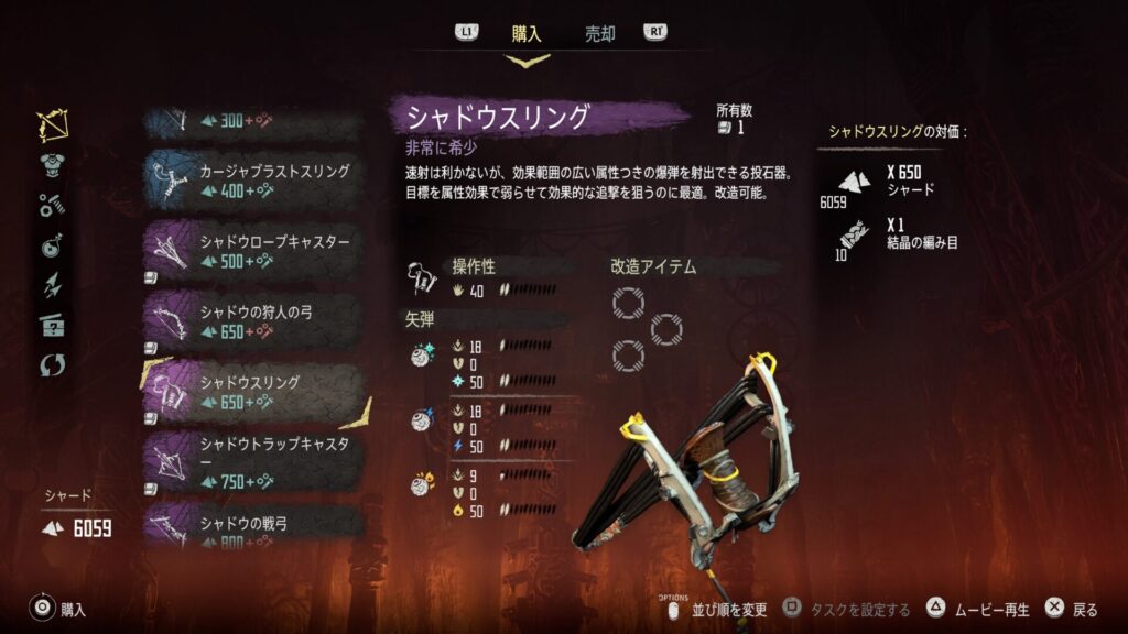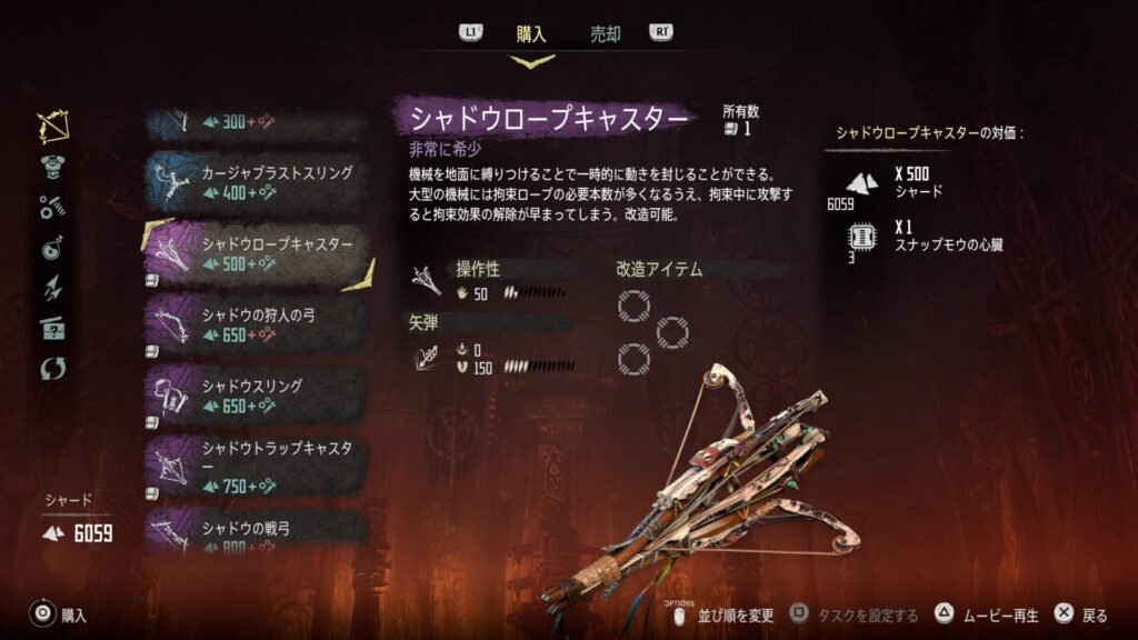 特にシャドウの長弓「爆裂の矢」とシャドウロープキャスター「拘束ロープ(重)」、シャドウスリング「氷の爆弾」は機械獣を倒す上でかかせない武器となります。