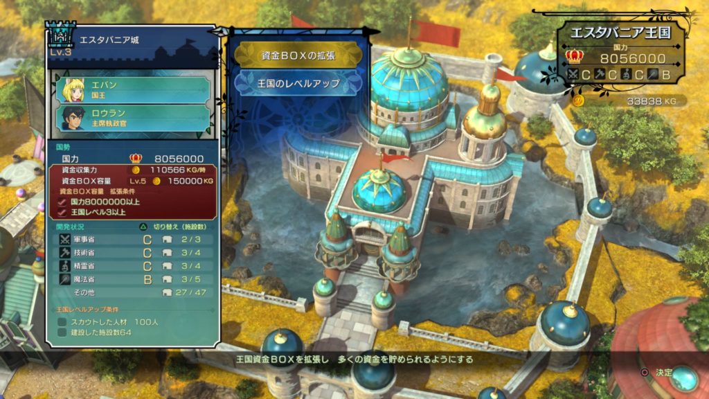 「資金BOXの拡張」とは、エスタバニア王国に蓄えておける資金の最大数を増やすことができます。