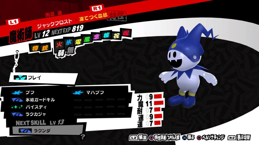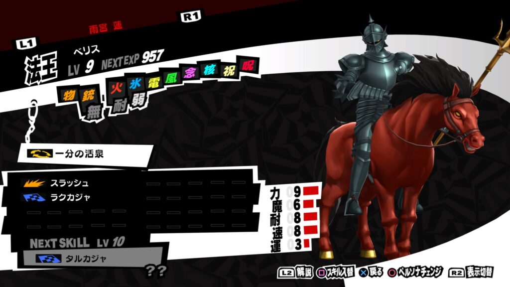このペルソナもカモシダパレスの強敵「べリス(暴虐の重騎兵)」に弱点を付ける氷結属性の「ブフ」が使用できるペルソナとなります。