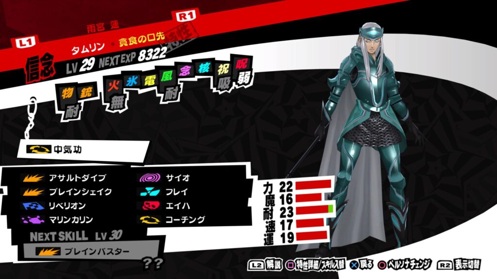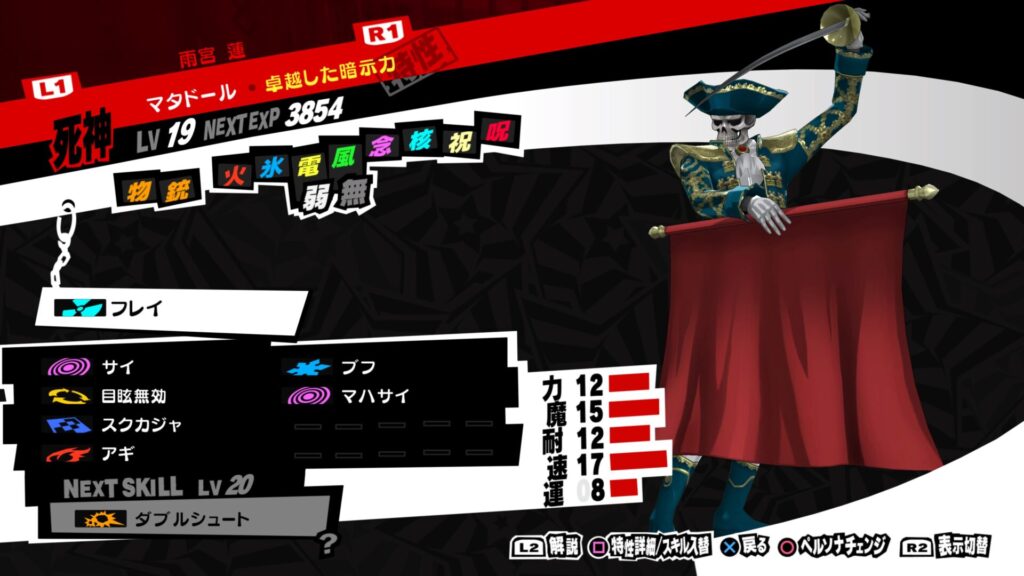 物理攻撃の特化型のペルソナとなります。物理攻撃に対する防御力も高く、物理属性には耐性があり銃属性には無効となっています。