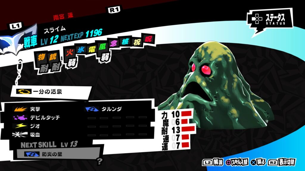 マダラメパレスではシャドウとして出現しないので合体で生み出す必要があります。一番の特徴としてはスライム系の強みである物理と銃撃に耐性があることです。