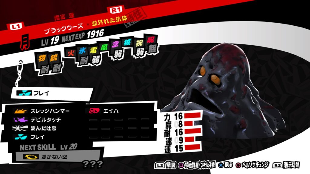 3体合体のペルソナなので基本的にはステータスが高くなっています。物理攻撃に特化しており、物理攻撃を与えつつ状態異常を付与するスキルが多くなっています。