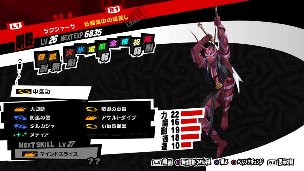 カモシダパレスの強敵なので仲間に出来れば非常に強力となります。最序盤での物理特化のペルソナであり、物理攻撃と防御力の高さが特徴となります。