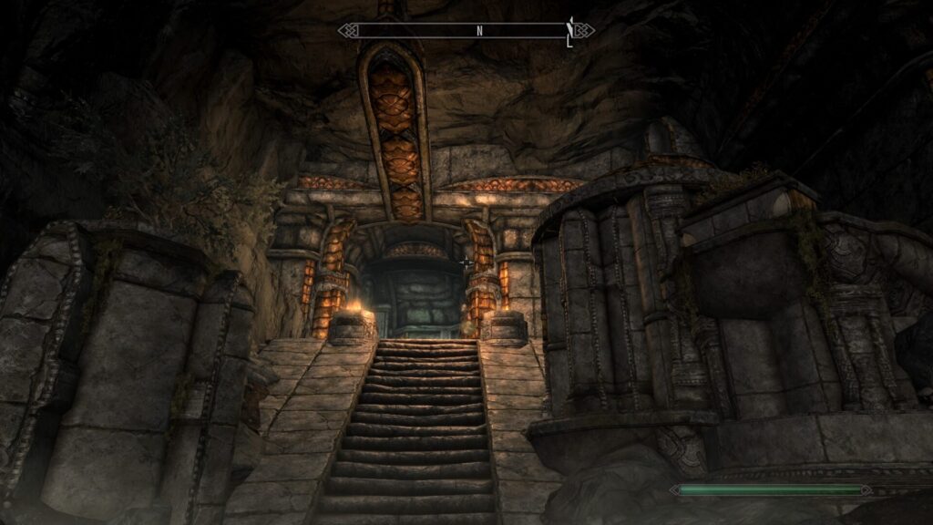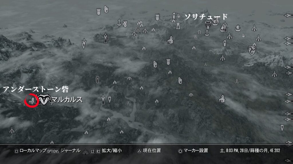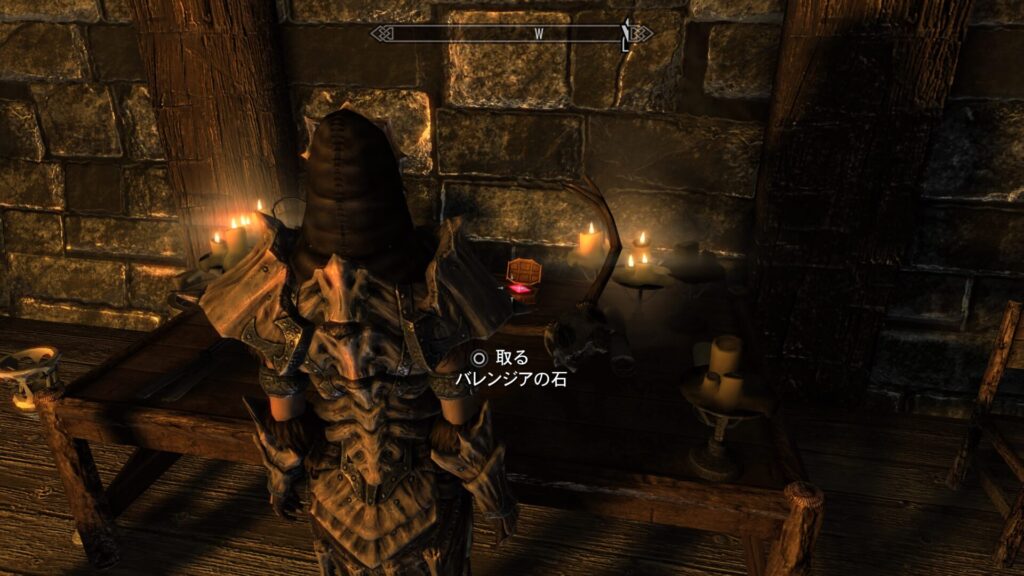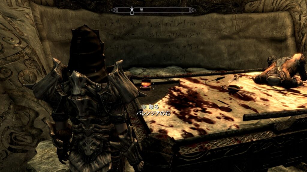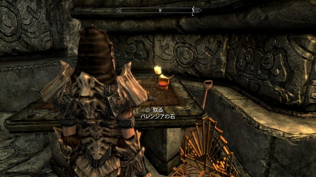 地図では南からホワイトランの地下墓地に入り左に曲がったすぐに階段を下りて左手に珍しい石が落ちています。