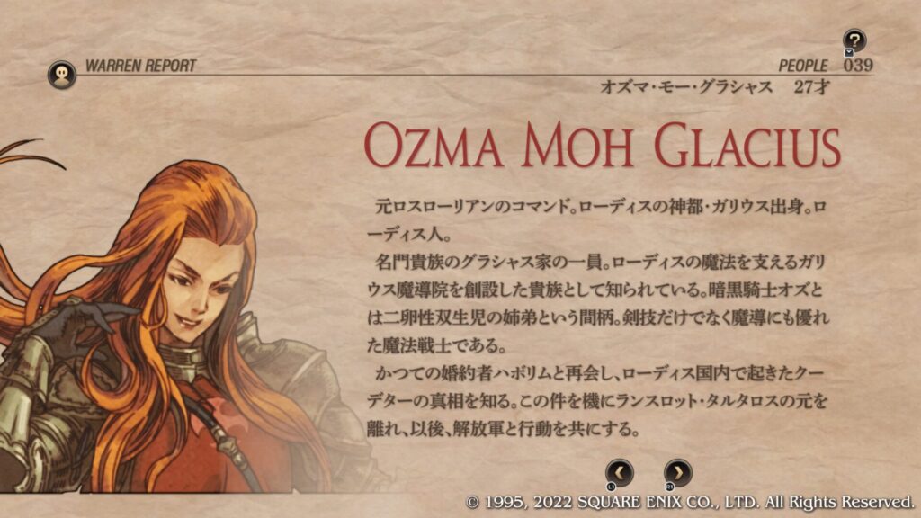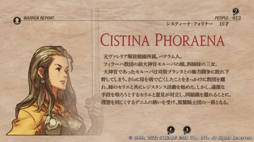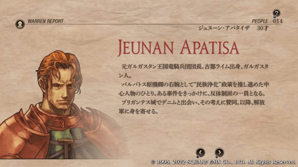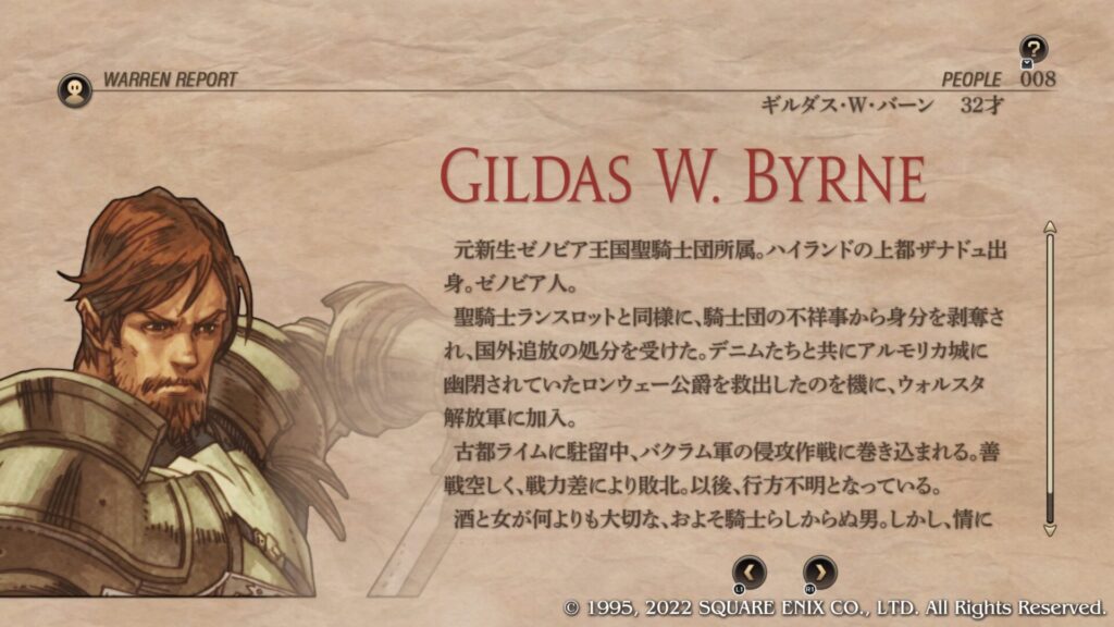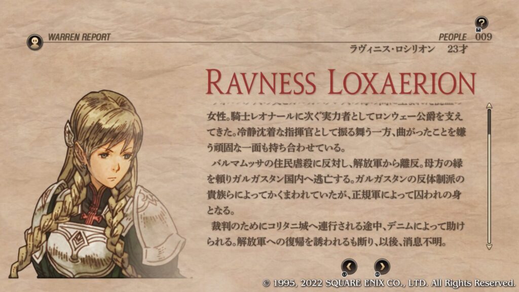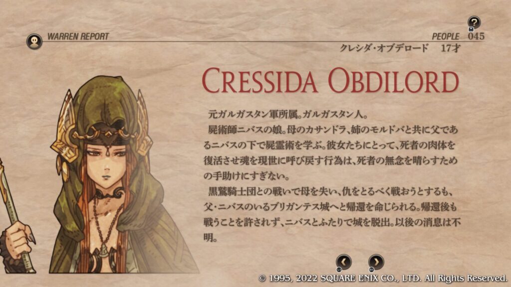 | Cルート加入条件 | 第4章序盤のブリガンテス城攻略後にウォーレンレポート「バルマムッサの屍人たち」を読みます。 ウォーレンレポートを読んだ後にバルマムッサの町で戦闘しオリアスを蘇生させて撤退させます。 第4章クァドリガ砦で戦闘が発生します。 第4章港町ゴリアテで戦闘が発生します。 クレシダを蘇生し生存させてクリアします。 戦闘後の選択肢で「君だけを裁くつもりはない」を選択します。 この時点でガルガスタン人のカオスフレーム数値が50以上あることが条件となっています。 |