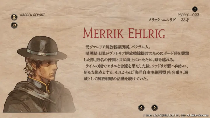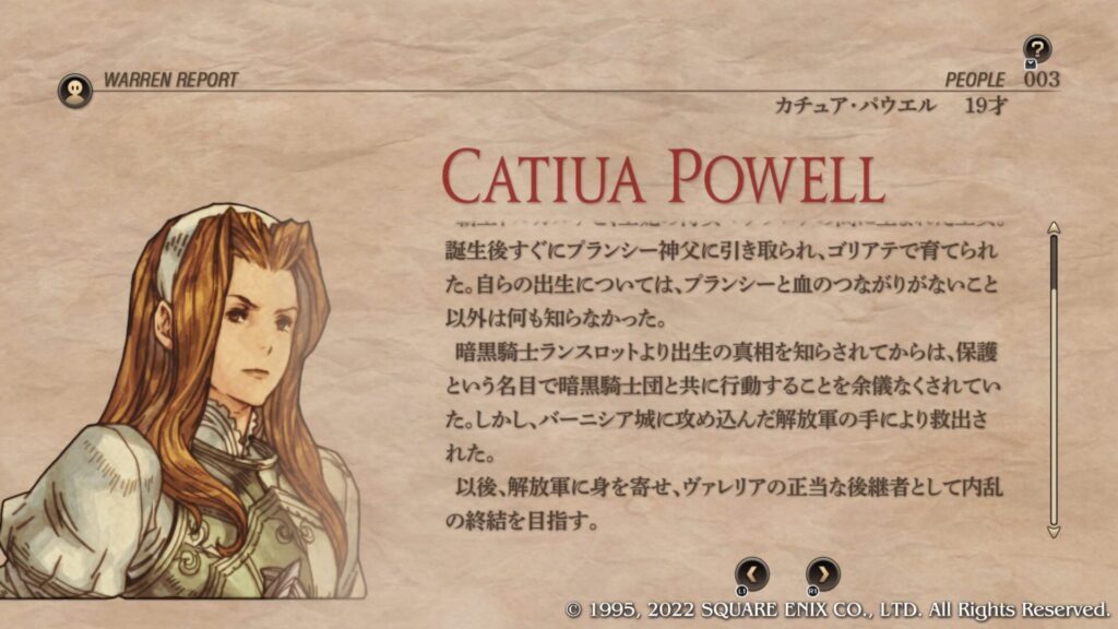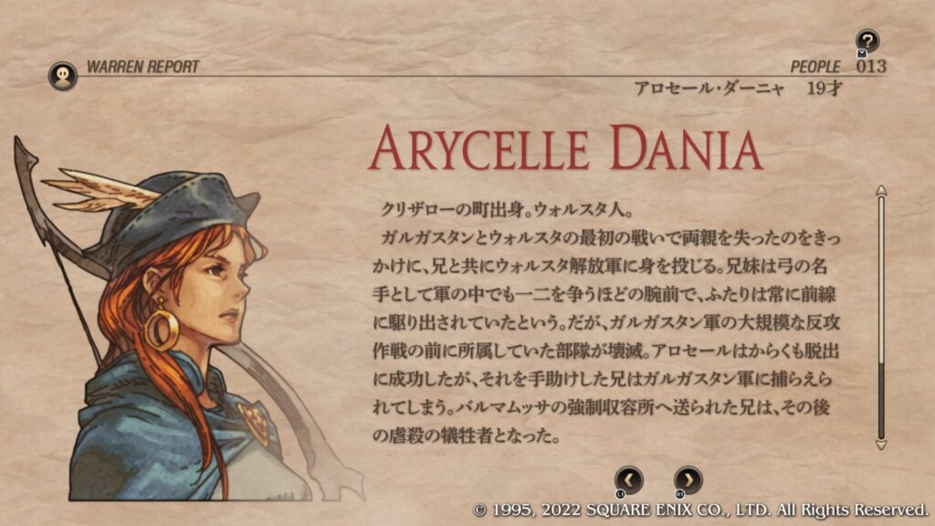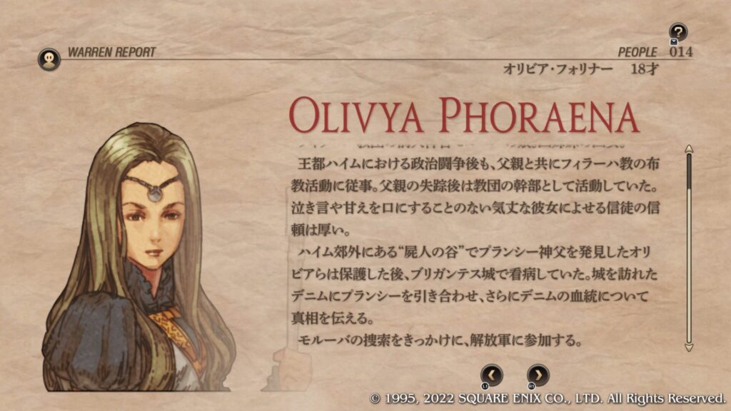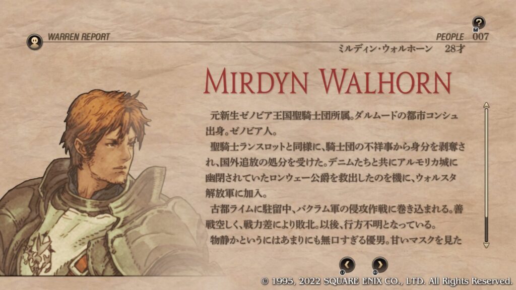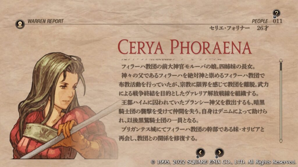 | Cルート加入条件 | 第4章序盤のブリガンテス城攻略後にウォーレンレポート「バルマムッサの屍人たち」を読みます。 ウォーレンレポートを読んだ後にバルマムッサの町で戦闘しオリアスを蘇生させて撤退させます。 第4章クァドリガ砦で戦闘が発生します。 第4章港町ゴリアテで戦闘が発生します。 クレシダを蘇生し生存させてクリアします。 戦闘後の選択肢で「君だけを裁くつもりはない」を選択します。 この時点でガルガスタン人のカオスフレーム数値が50以上あることが条件となっています。 |