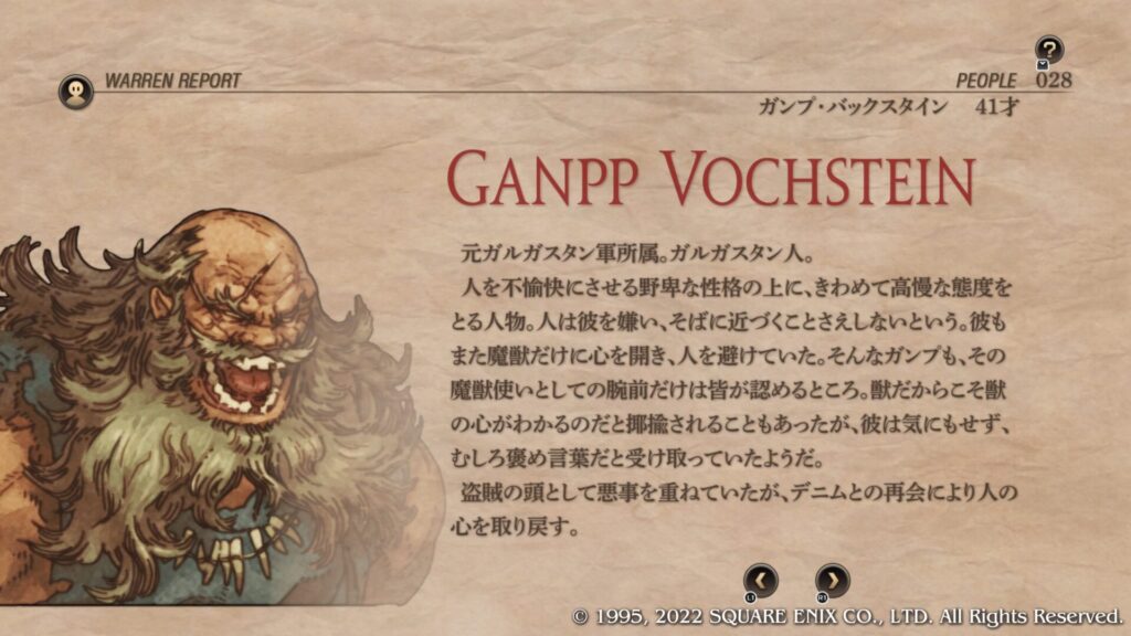 | 4章共通加入条件 | レンドルが加入するグリムスビーの町をクリア後にウォーレンレポート「ニムラハバの盗賊」を読みます。 ニムラハバの森の戦闘でベルダJr.とオブダJr.を倒さずにガンプも瀕死の状態でクリアすることで加入します。 |