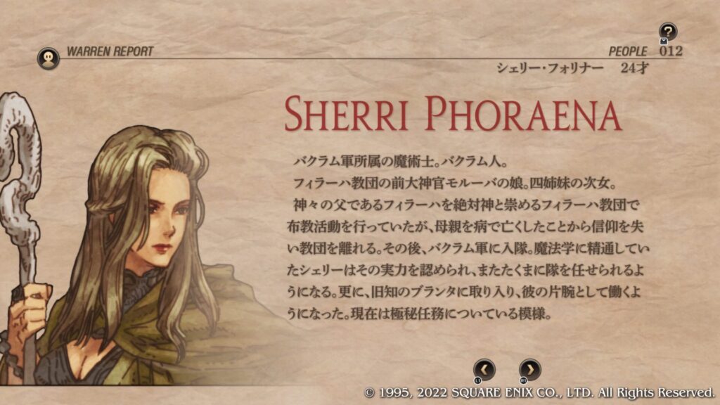 | 4章共通加入条件 | 第4章で下記の条件を全てクリアした状態でバルマムッサの町を訪れると加入します。 【条件1】バンハムーバ神殿の戦闘でシェリーを倒さずに瀕死の状態にしてクリアすること。 【条件2】オリビアが生存しておりオリビアの忠誠度が60以上こと。 【条件3】4章バーニシア城攻略前であること。 【条件4】バルマムッサの町に到着した時の天候が豪雨であること。 |