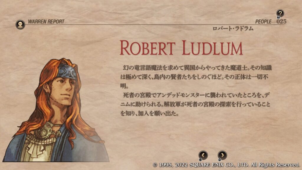 | 4章共通加入条件 | 第4章バンハムーバ攻略後にフィダック城でイベントを見た後、ウォーレンレポート「エクシター島で謎の大爆発」を読みます。 死者の宮殿の地下2階の戦闘でラドラムを生存させてクリアします。 クリア後の選択肢「いいでしょう」を選ぶと加入します。 |