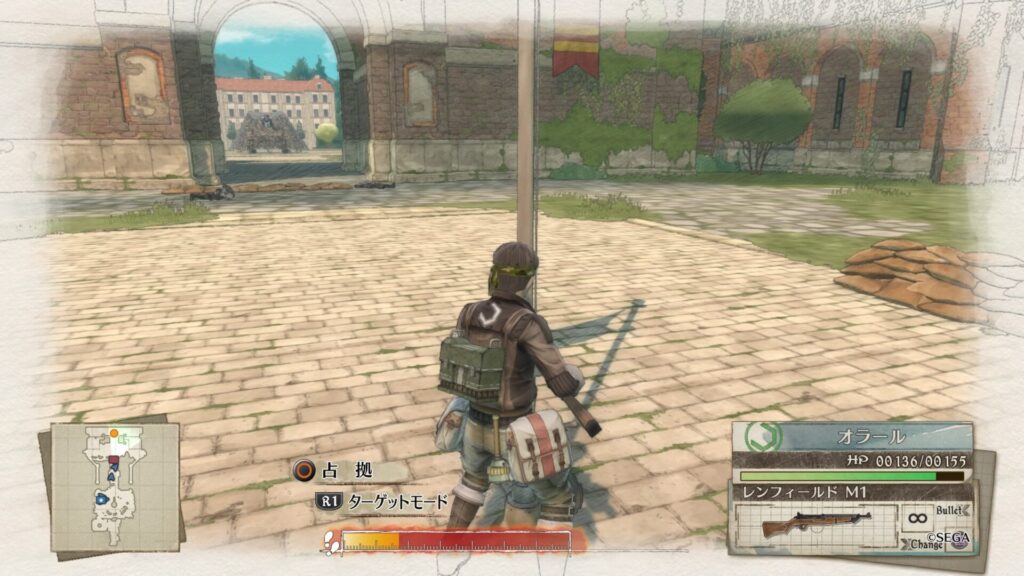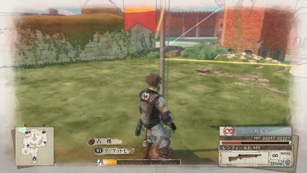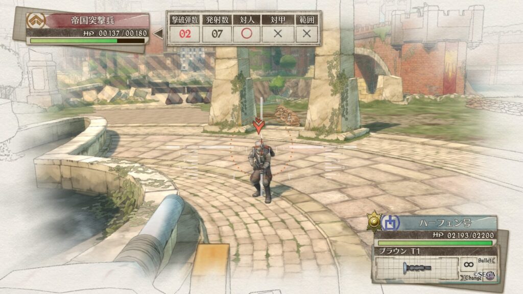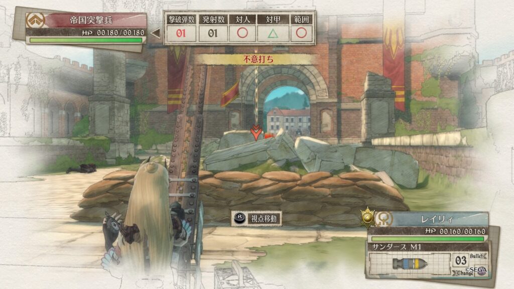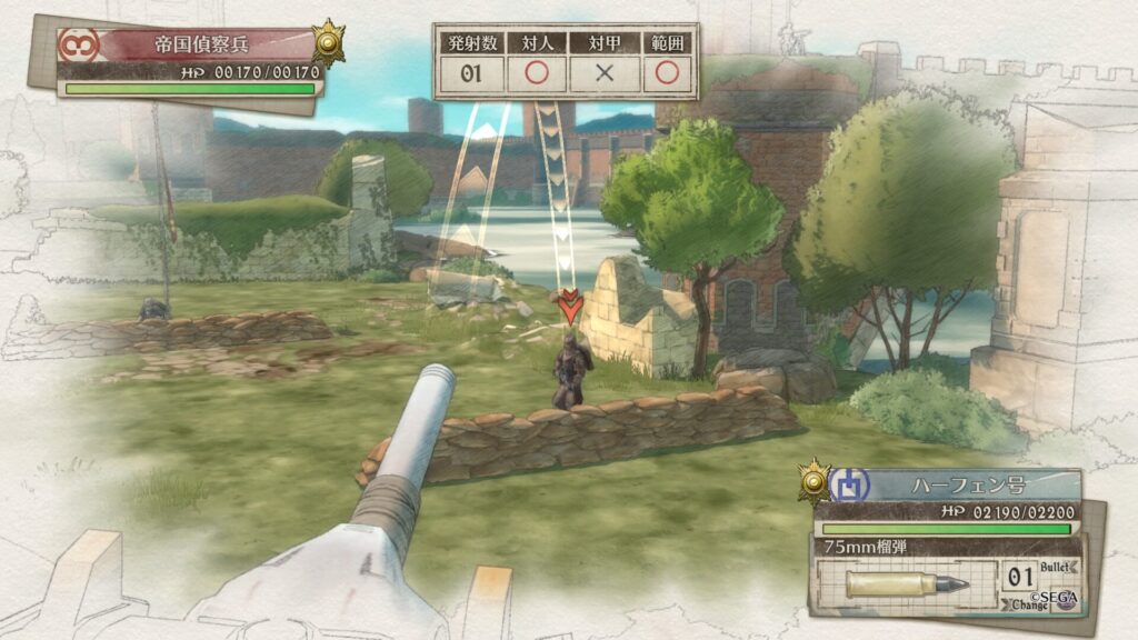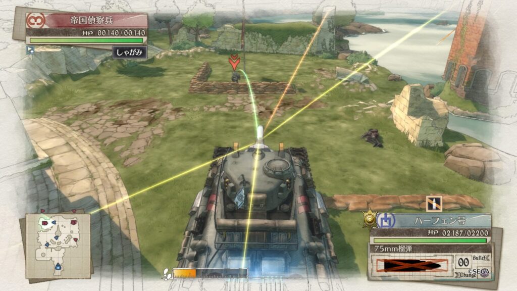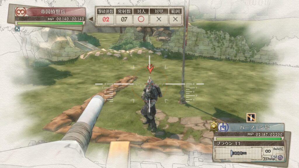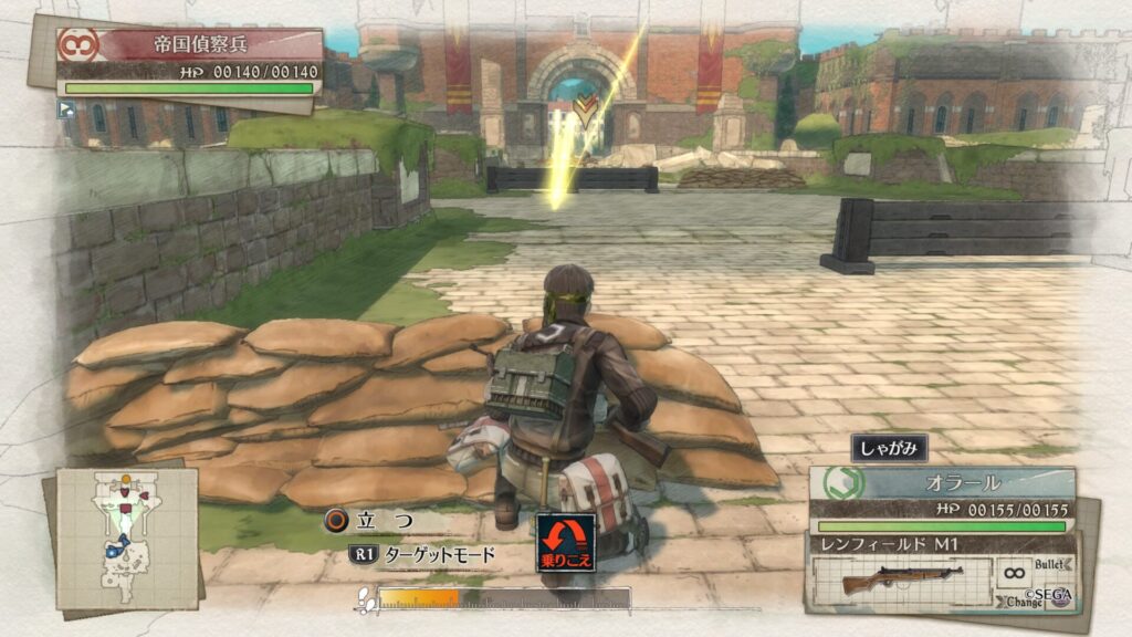そのままハーフェン号で北西の敵本拠地へ進軍し土嚢にしゃがんでいる帝国偵察兵を倒します。