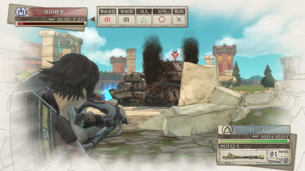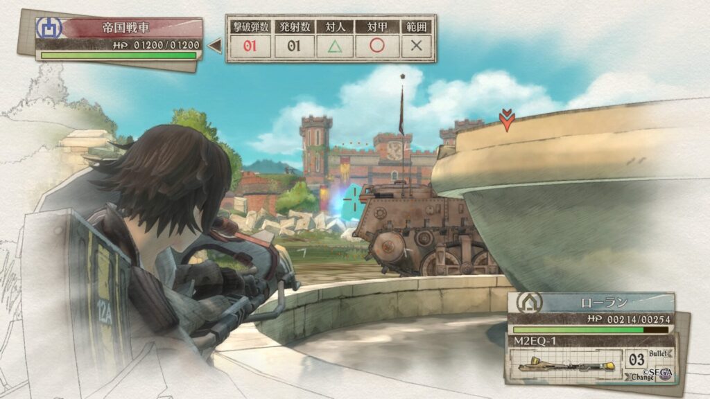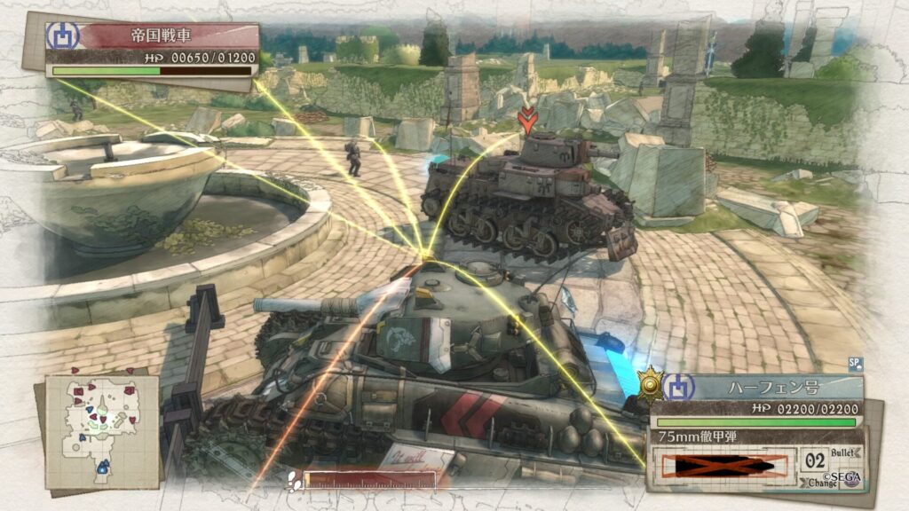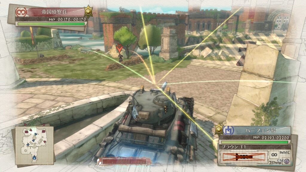 敵戦車の後ろを取りたいところですが地形的に距離的に不可能なので敵戦車本体に攻撃をします。