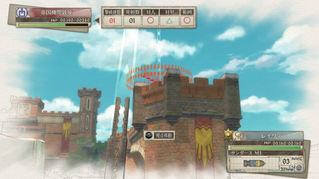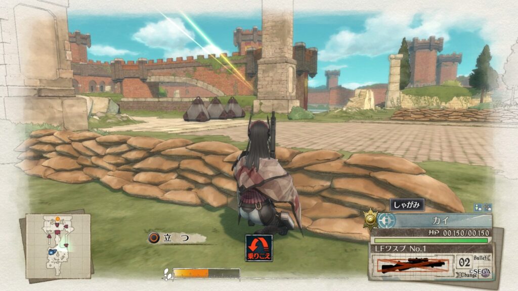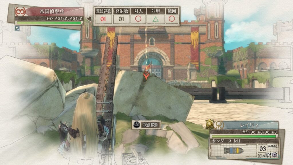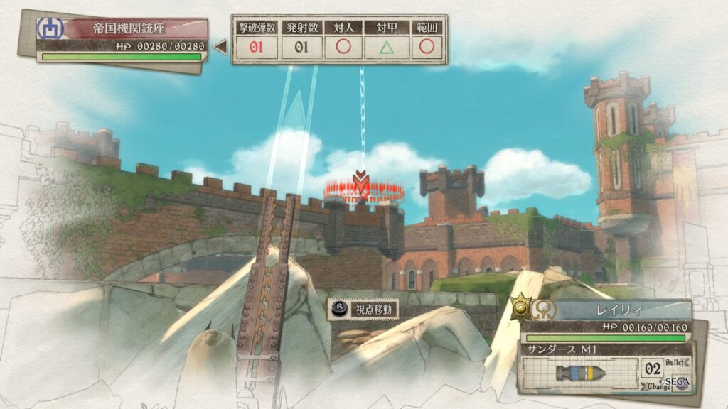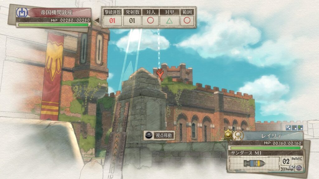 カイで南東の帝国機関銃座を狙います。ここは倒す目的ではなくあくまでレイリィを出現させるための行動となります。