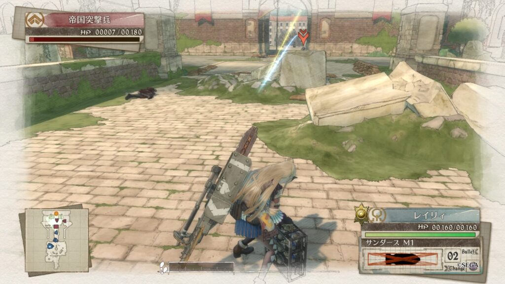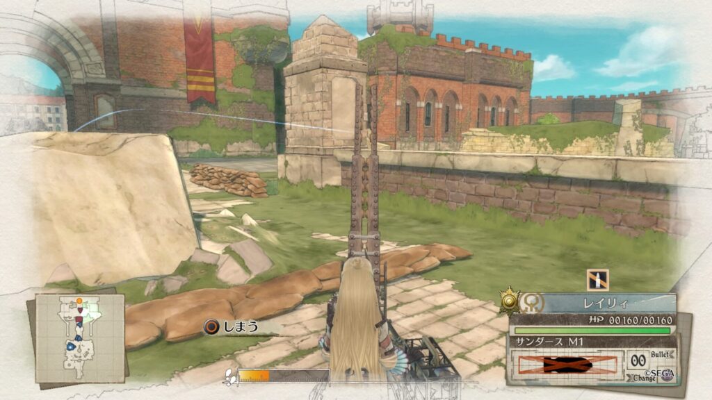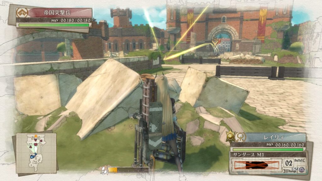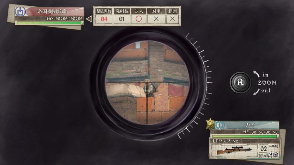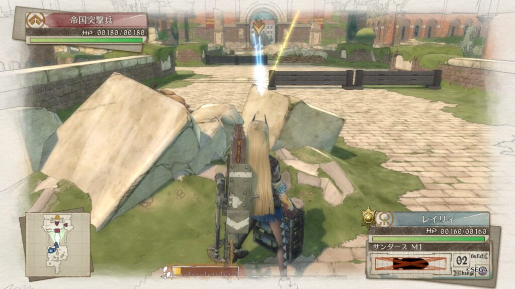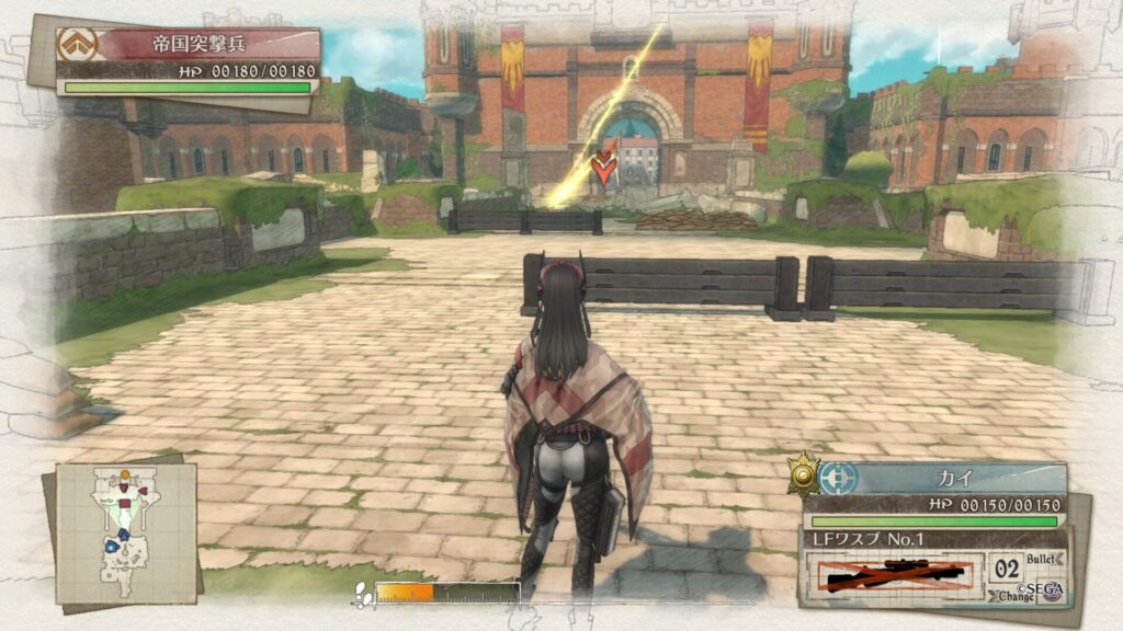 カイで南東の帝国機関銃座を狙います。ここは倒す目的ではなくあくまでレイリィを出現させるための行動となります。
