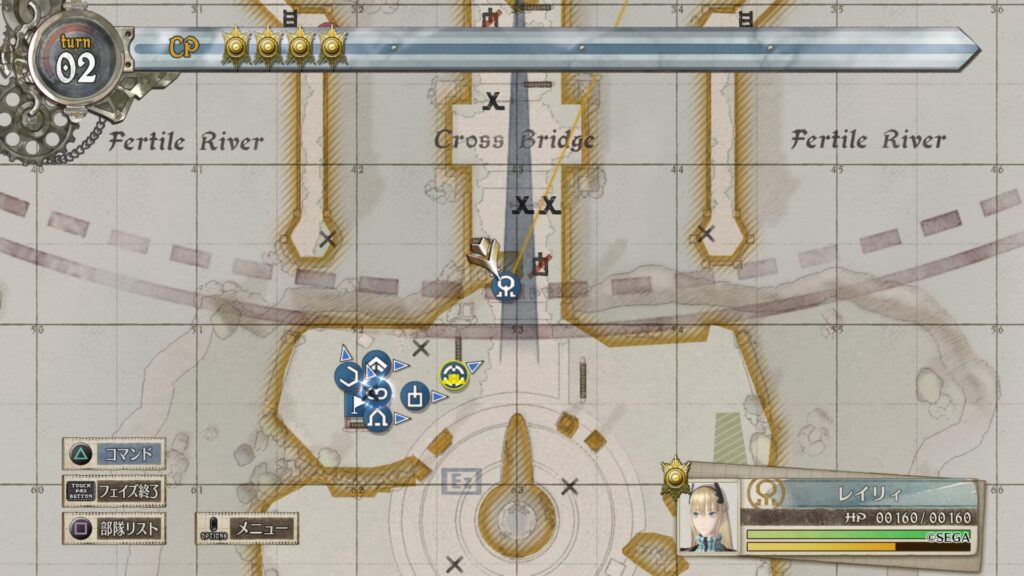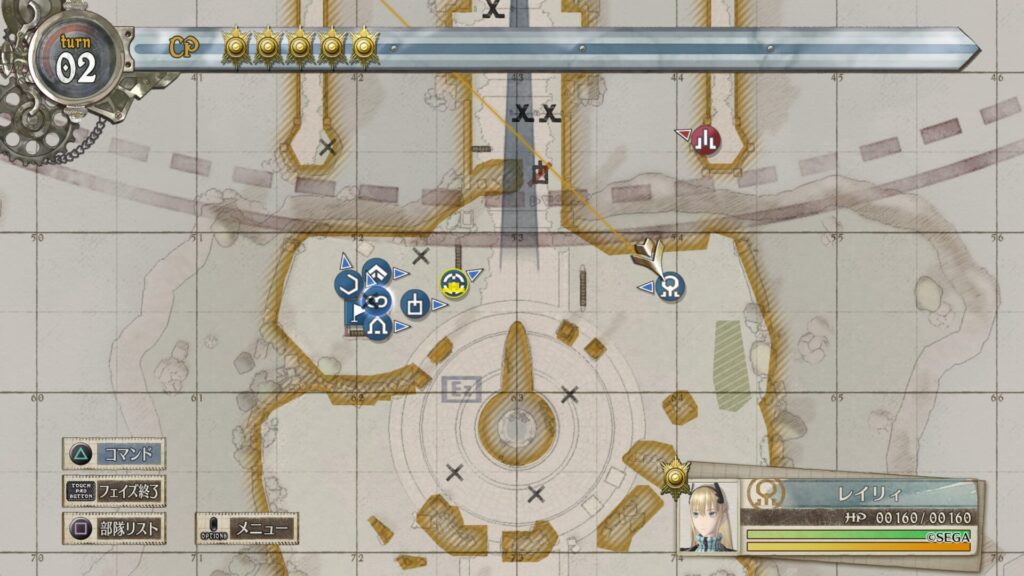 ユニット行動を2回行ったのでレイリィが到着しました。まずは目の前の南東の帝国機関銃座を撃破します。