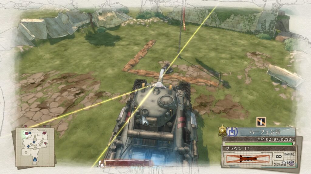 今回の攻略ではハーフェン号でそのまま敵本拠地へ突っ込んで土嚢を破壊し、戦車搭載のマシンガンで倒しています。