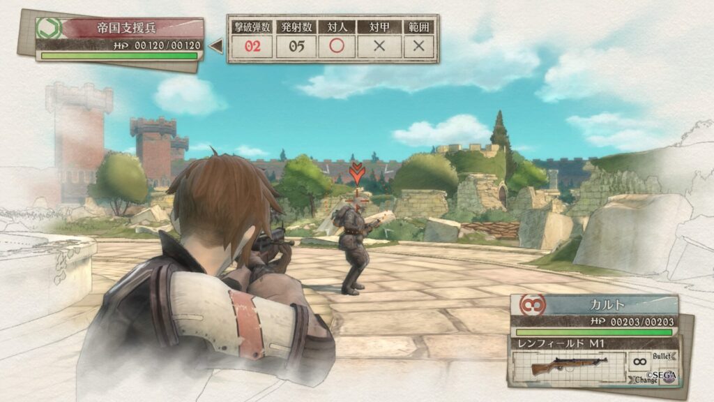 レイリィが到着するまではカイで目の前の南西の帝国機関銃座を攻撃します。ここで攻撃することで味方との連携攻撃が可能となるので命中すれば倒せます。