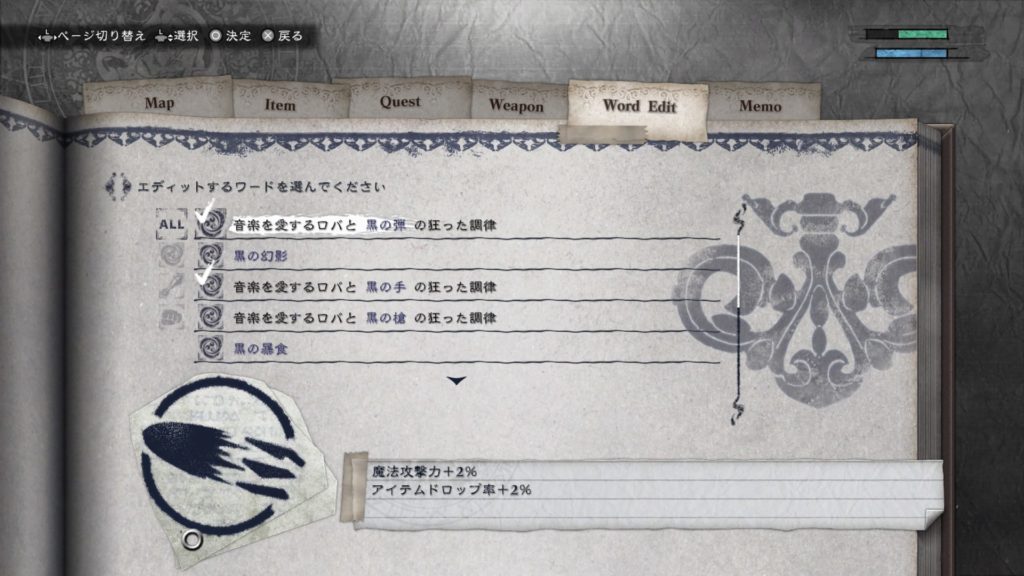 入手した「ワード」を武器や魔法、体術に割り当てることで、その「ワード」が持っている特殊な効果を付与することができます。