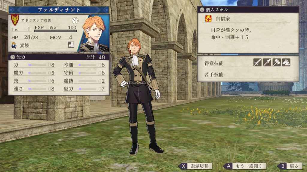 個人スキルの自信家はHPが満タンのときに命中・回避が+15となるので回避アタッカーとして活躍できます。スキルやステータスにおいても剣士系の兵種はスタイルに合っており活躍できます。