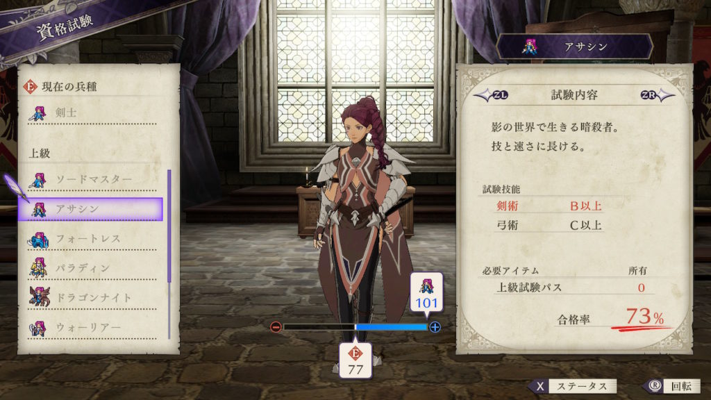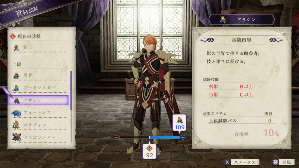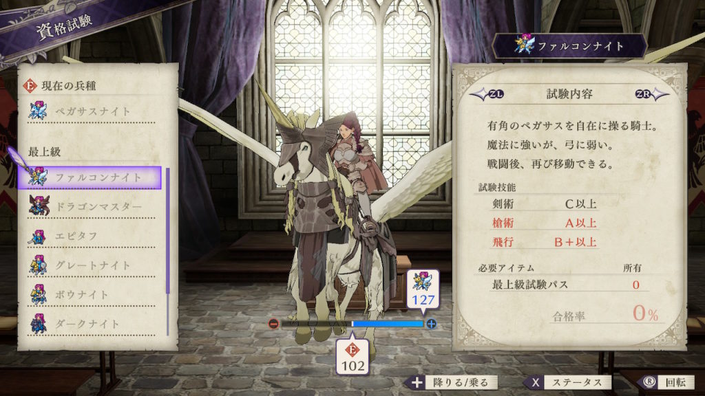 最終兵種として「ファルコンナイト」を目指していますが、上級職には同等の飛行職がないので出来るだけ技能が無駄にならないアサシンとしました。最上級職にクラスチェンジするまでそのままペガサスナイトでも良いです。
