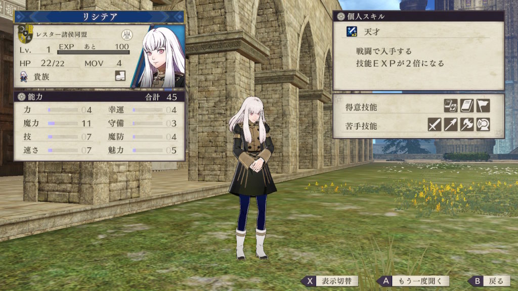 リシテアは初期の能力から魔力が高いので兵種に迷うことなく魔法職一択となります。