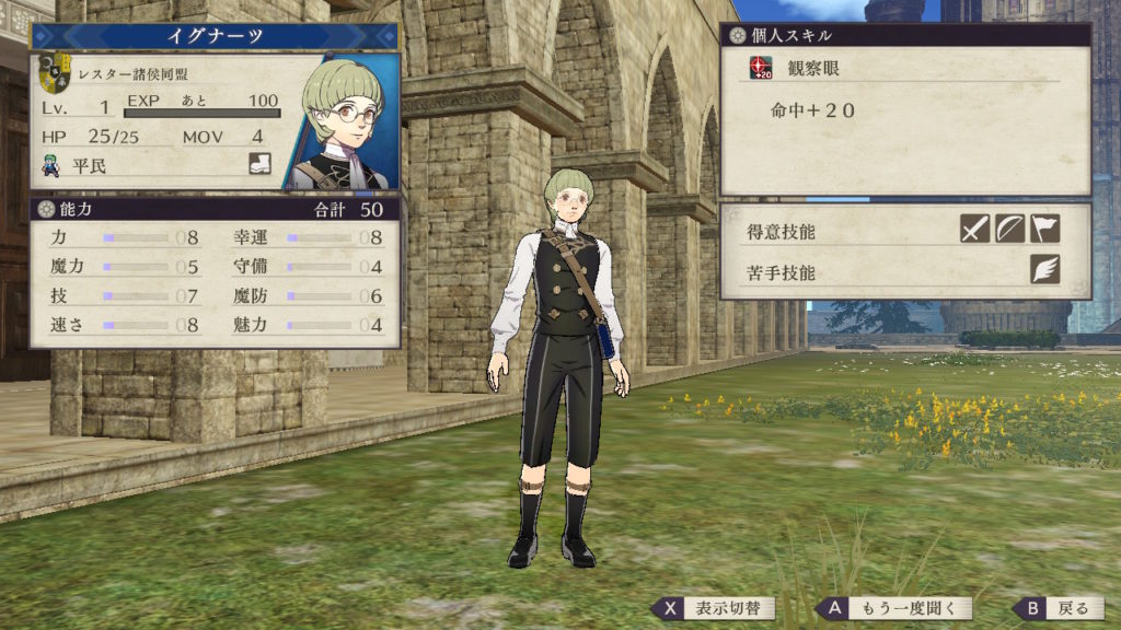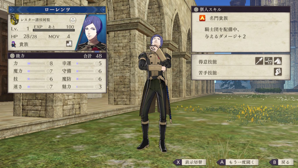 槍術や馬術が得意なのでナイト系に育成することが多いですが、紋章効果を考えると理学を伸ばして魔法職キャラにするのがおすすめです。
