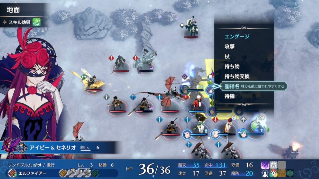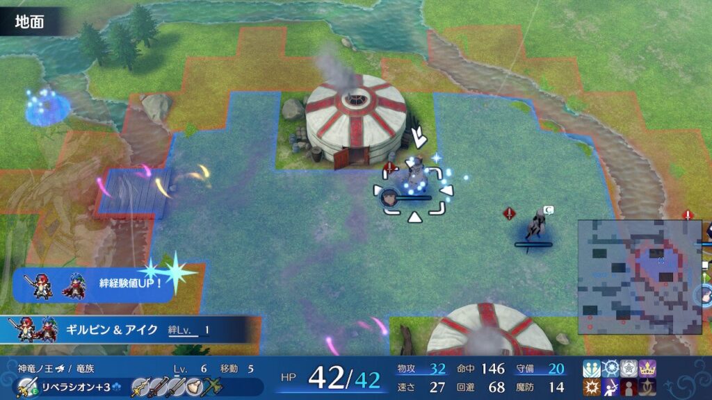 半端ない敵の攻撃を耐えることができたら、「チキ」のブレスで攻撃します。攻撃範囲が後ろの3マスも入るので敵を大きく減らしながら多くの経験値を得ることができます。3ターンでエンゲージは解除されてしまうので、3ターン内でおおよその敵を一掃しておくと効果的となります。