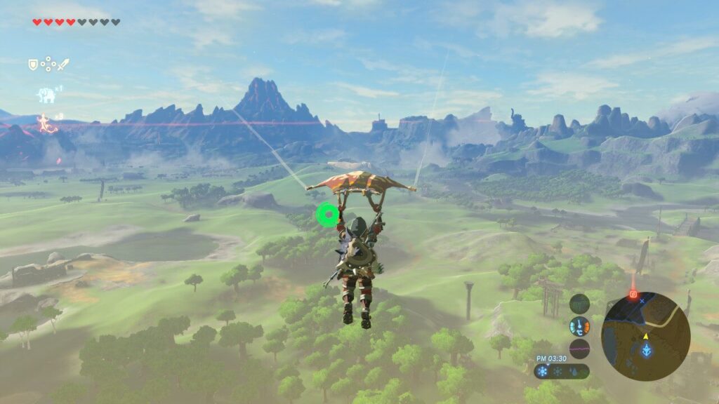冒険の舞台であるハイラル全土に自由に出られるようになるには、まず「パラセール」の入手が必須です。ゲーム開始直後にたどり着く「始まりの台地」は、高い崖に囲まれていて、そのままでは外に出ることができません。