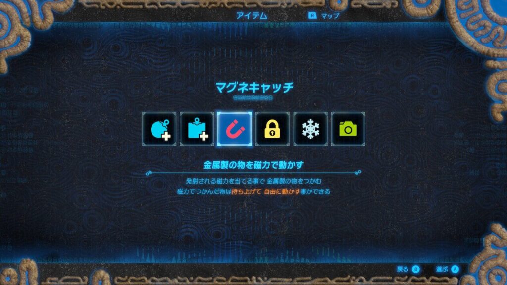 序盤の祠では、「シーカーストーン」に新たなアビリティを追加していくことになります。代表的なものに「リモコンバクダン(遠隔爆破)」「マグネキャッチ(金属を操作)」「アイスメーカー(水面に氷柱を出現)」「ビタロック(時間停止)」などがあり、いずれも戦闘や謎解き、探索に欠かせないツールです。