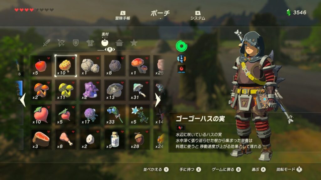 序盤のリンクは裸同然の状態で冒険を始めます。敵に囲まれれば一瞬でやられてしまうため、まずは周囲で使える武器や防具、回復用の食材を積極的に集めましょう。