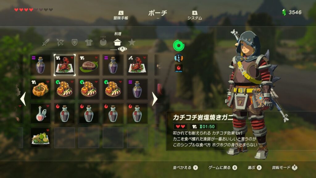 ポーションのようなアイテムではなく、食材を組み合わせて「料理」を作ることで体力やスタミナを回復したり、特定の耐性効果を得たりします。