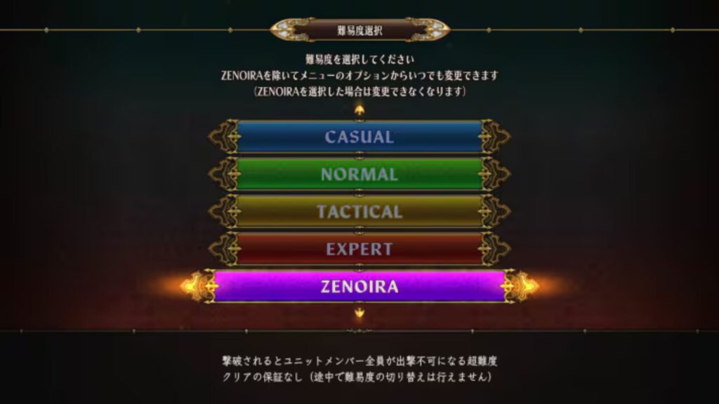 ゲームをクリアすると、新たな挑戦として「ZENOIRA」モードが解放されます。このモードは通常の難易度とは比べ物にならないほどの難しさで、戦闘不能になったキャラクターはその戦闘後から出撃不可になるという厳しいルールが特徴です。