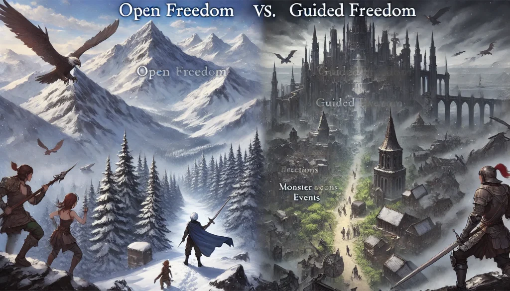 ウィッチャー3にも広大なオープンワールドがあり、探索や寄り道を楽しむ自由は十分あります。しかし、自由度という点ではスカイリムほど「何でもできる」タイプではありません。なぜなら、ウィッチャー3は主人公がゲラルトという固定キャラクターであり、ゲーム全体も「ゲラルトの物語をどう体験するか」を中心に作られているからです。つまり、自由に生き方を選ぶというより、用意された世界と物語の中で多くの選択をしていくゲームです。